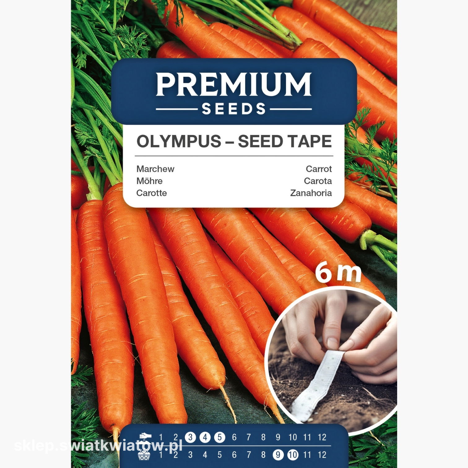 Marchew Olympus – NA TAŚMIE (Daucus carota) należy do grona wszechstronnych odmian późnych. Jest doskonała do spożycia bezpośredniego, na przetwory oraz do długiego przechowywania. Jej korzenie – proste, stożkowate w kształcie, odporne na pękanie – są bardzo długie, osiągają bowiem przeciętnie 20-25 cm. Oferowana odmiana posiada intensywnie pomarańczowy miąższ, słodki, kruchy, bardzo smaczny, oraz skórkę w równie żywym, soczystym odcieniu, niepodatną na zazielenienia. Długa, mocna nać ułatwia zbiór korzeni. Marchew Olympus cechuje się bardzo wysoką zawartością beta-karotenu, witamin i składników mineralnych, a jako odmiana bogata w cukry jest chętnie zjadana przez dzieci – na surowo, w sokach i przecierach.