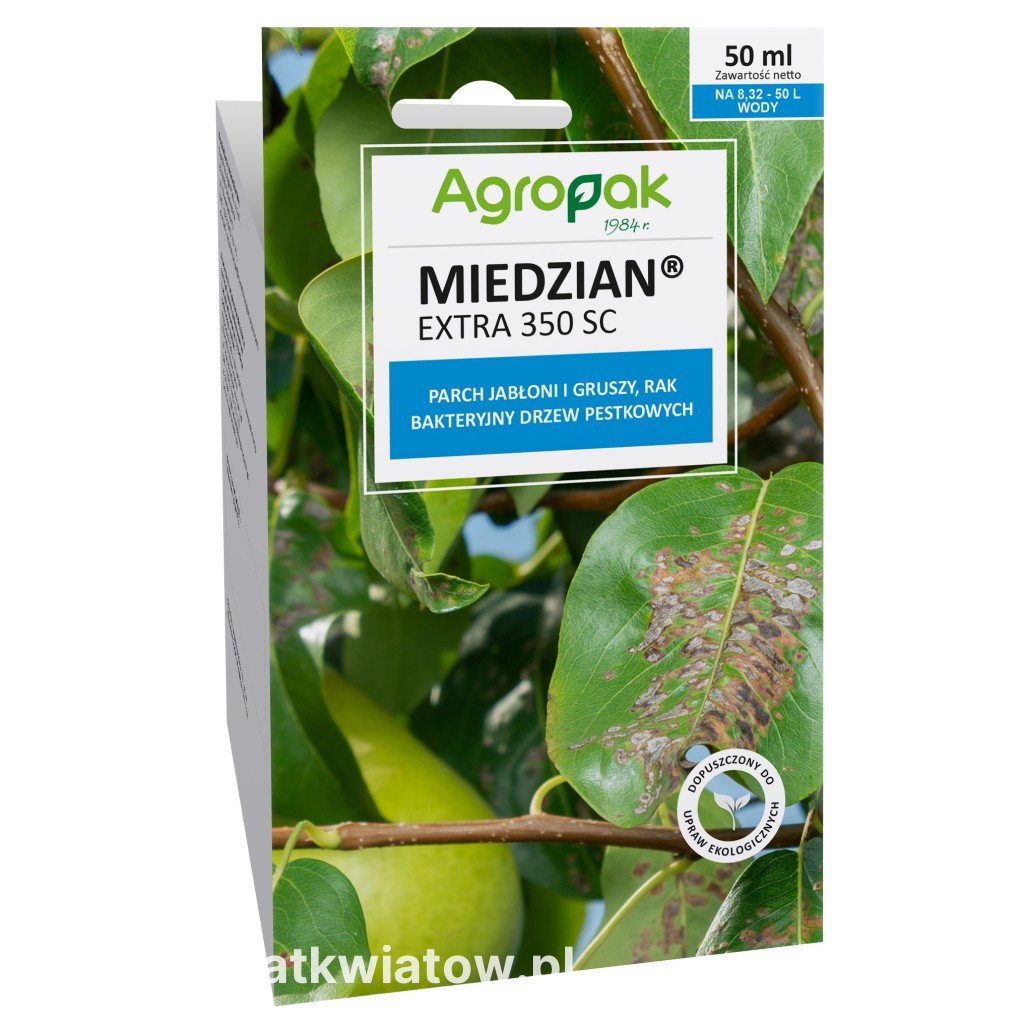 Miedzian Extra 350 SC Agropak to środek grzybobójczy i bakteriobójczy przeznaczony do ochrony drzew owocowych przed najczęściej występującymi chorobami bakteryjnymi i grzybowymi. Preparat działa powierzchniowo, tworząc na roślinie warstwę ochronną, która zabezpiecza ją przed rozwojem infekcji. Zawiera miedź w postaci tlenochlorku miedzi i ma formę stężonej zawiesiny do rozcieńczania wodą przed zastosowaniem. Produkt przeznaczony jest do stosowania przez użytkowników nieprofesjonalnych i może być używany również w uprawach ekologicznych.