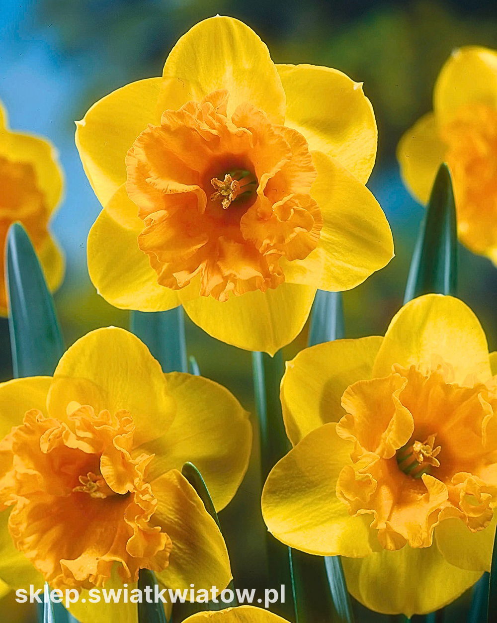Narcyz 'Mirar' jest kwiatem jednokształtnym, który przyciąga uwagę swoimi kanarkowożółtymi płatkami otaczającymi falbaniaste, pomarańczowe środki. Jego wiosenne barwy są nie tylko żywe, ale i zachwycające, co sprawia, że roślina ta staje się centralnym punktem każdej przestrzeni ogrodowej czy domowej. Osiągając wysokość 30-40 cm, 'Mirar' doskonale prezentuje się w grupach, jako solista w doniczkach, czy w kompozycjach z innymi wiosennymi cebulkami. 'Mirar' rozkwita obficie od kwietnia do maja, co sprawia, że jest doskonałym wyborem do przedłużania sezonu kwitnienia w ogrodzie.