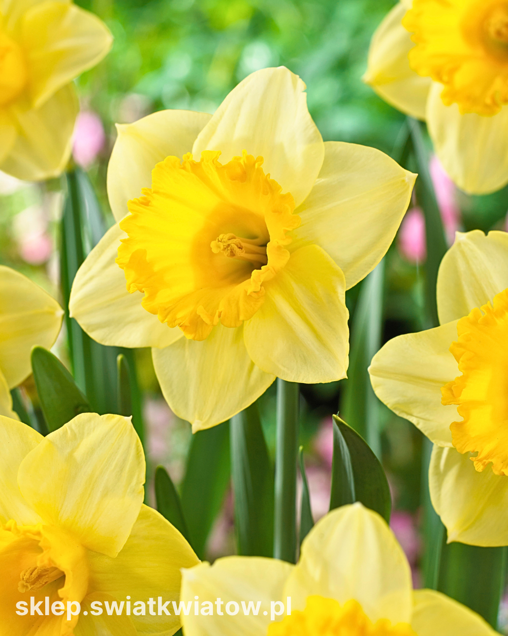 Narcyz 'Signor' to odmiana o dużych koronach, które robią wrażenie swoim nietypowym kolorem i pokrojem. Kwiaty zaczynają się od kremowo-żółtych płatków, które w miarę kwitnienia blakną prawie do bieli, tworząc piękny kontrast z miękką, jasnożółtą, dużą i marszczoną miseczką. Ta cecha sprawia, że każdy kwiat jest wyjątkowy i ewoluuje wizualnie na przestrzeni sezonu. Roślina osiąga wysokość około 45 cm, a jej łodyżki są mocne i trwałe, co czyni ją doskonałą także jako kwiat cięty.