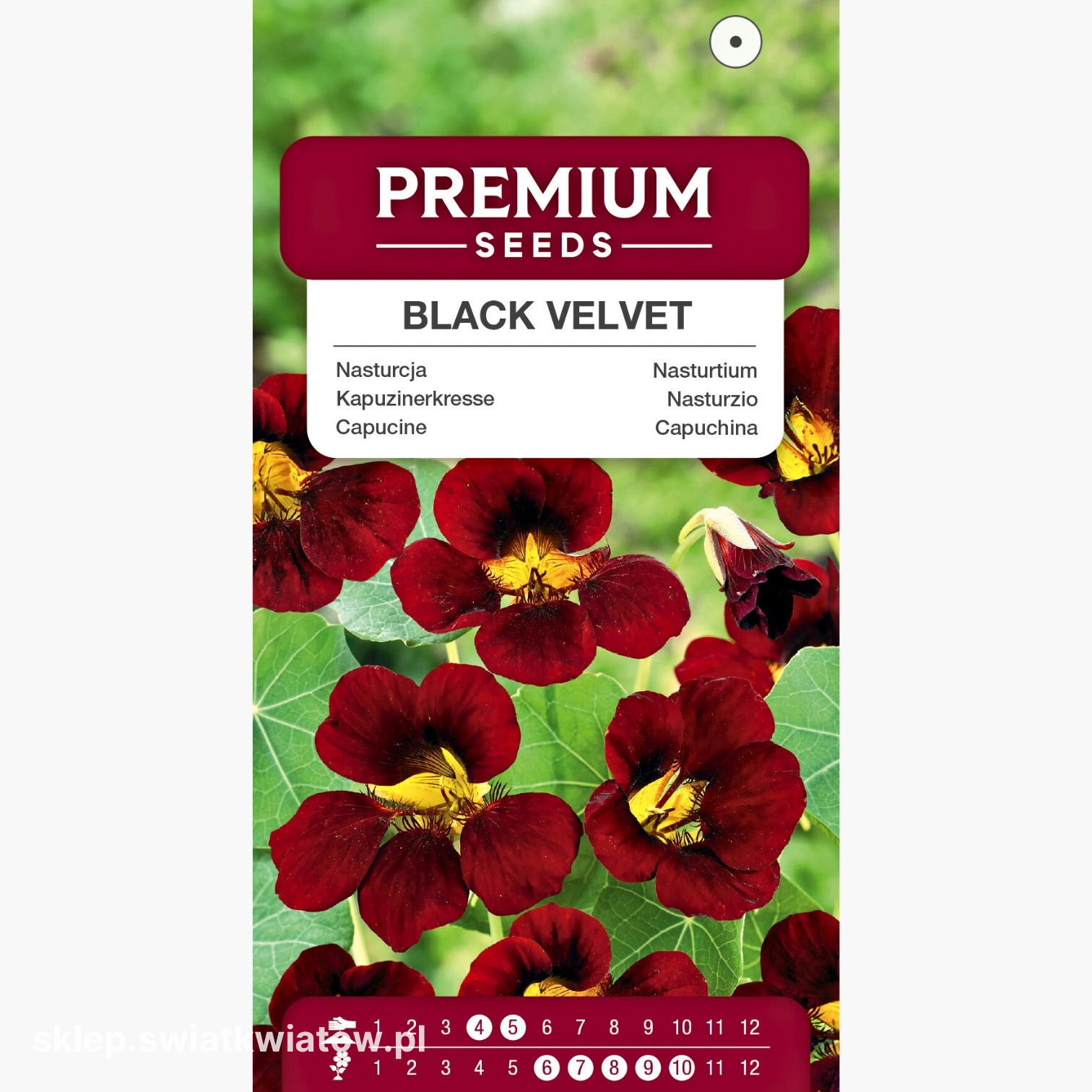 Nasturcja niska Black Velvet kwitnie od czerwca do października, oferując długi okres dekoracyjności w ogrodzie.