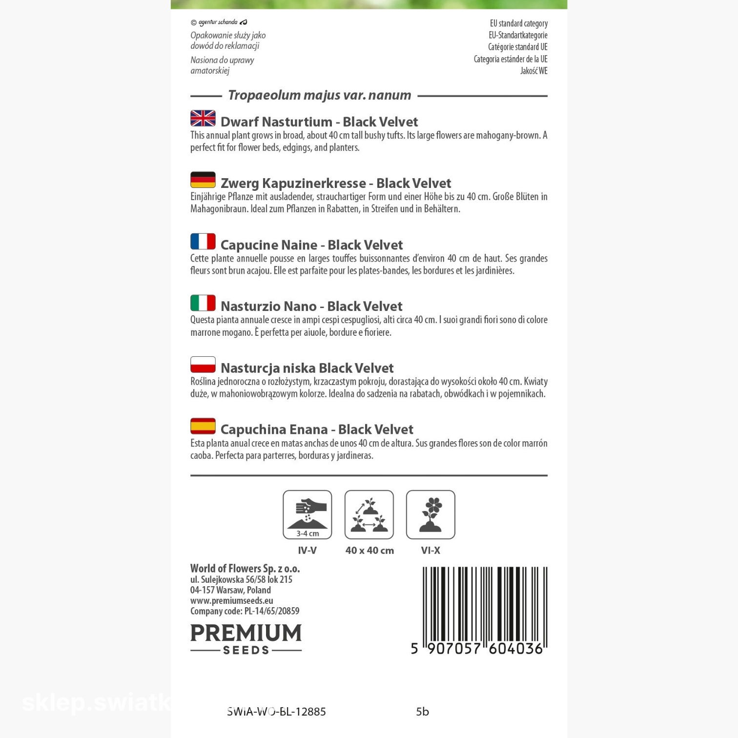 Nasturcja niska Black Velvet to niezwykła roślina jednoroczna, która przyciąga uwagę swoim mahoniowobrązowym kolorem kwiatów. Jej rozłożysty, krzaczasty pokrój dorasta do 40 cm wysokości, co czyni ją idealnym wyborem do dekoracji rabat, obwódek oraz pojemników. Tropaeolum majus var. nanum, bo tak brzmi jej łacińska nazwa, świetnie komponuje się w ogrodzie, dodając mu elegancji i niepowtarzalnego uroku. Dzięki swojej unikalnej barwie, nasturcja ta stanowi doskonałe uzupełnienie dla innych roślin ozdobnych, tworząc harmonijne kompozycje kwiatowe.