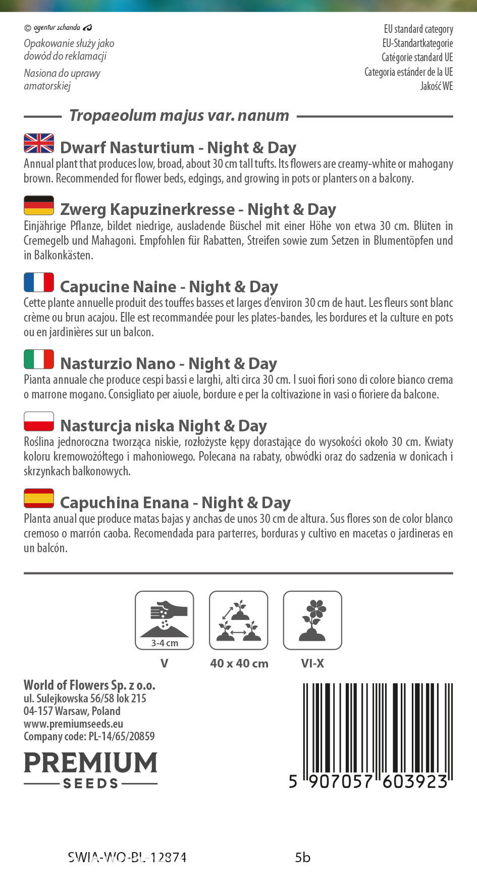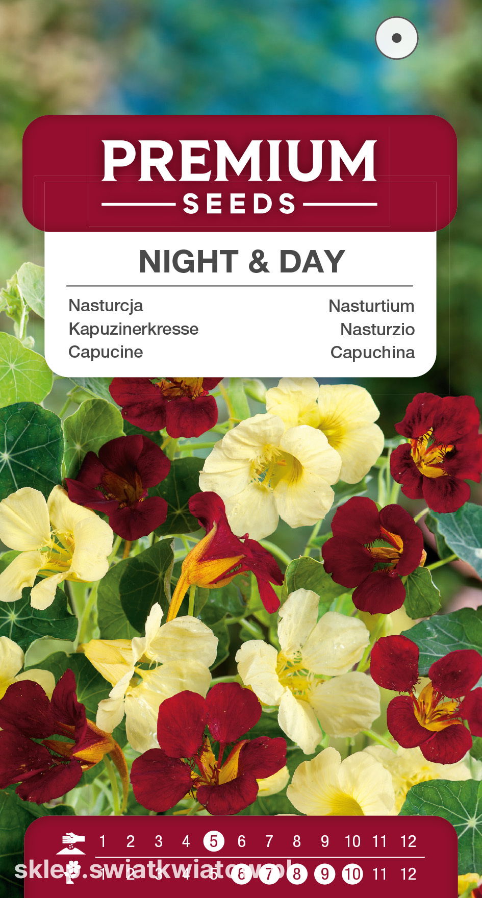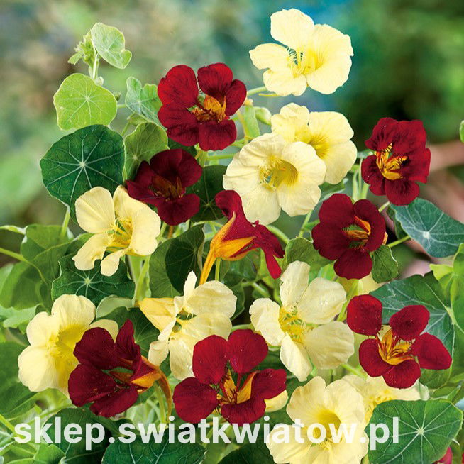 Roślina jednoroczna. Ciekawa mieszanka nasturcji karłowej o kwiatach kremowych i mahoniowych, przyciągająca pożyteczne owady. Idealna do pojemników i na obwódki. Rośliny osiągają wysokość ok. 30 cm.