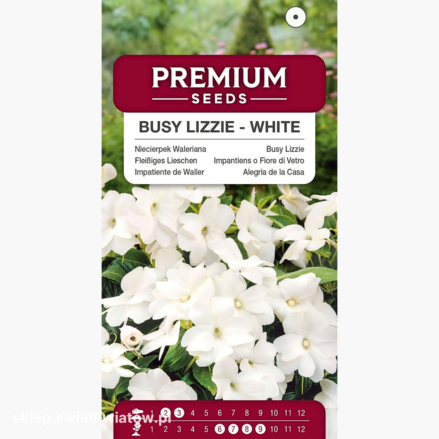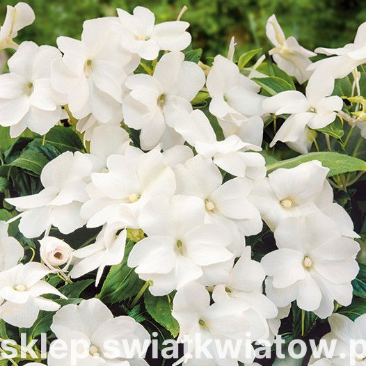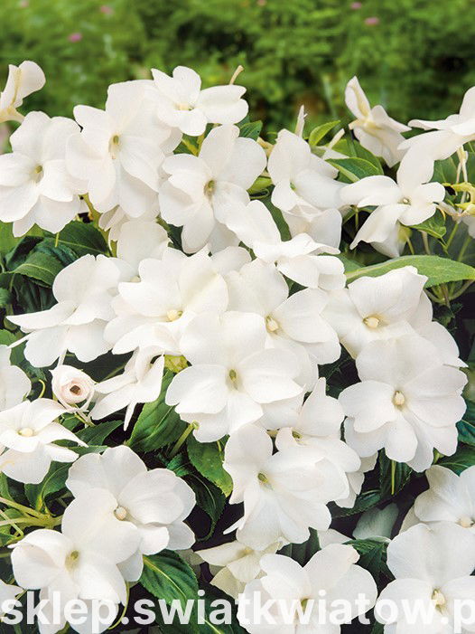Niecierpek Waleriana – biały to jednoroczna roślina kwitnąca, wyróżniająca się dużymi, płaskimi, śnieżnobiałymi kwiatami, które pojawiają się na rozgałęzionych łodygach. Jej eliptyczne, ząbkowane i lśniące liście w połączeniu z białymi kwiatami tworzą elegancką i harmonijną kompozycję. Kwiaty rozwijają się z kątów liści, tworząc urokliwe akcenty w ogrodzie. Roślina doskonale nadaje się do obsadzania rabat, donic oraz tworzenia kompozycji z innymi roślinami, gdzie może pełnić zarówno rolę głównej ozdoby, jak i tła. Niecierpek kwitnie długo i obficie, aż do pierwszych przymrozków, co czyni go niezwykle efektownym elementem ogrodu przez całe lato i jesień.