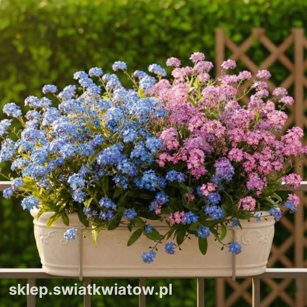 W skład zestawu wchodzą 2 odmiany niezapominajki alpejskiej: niebieska oraz różowa.