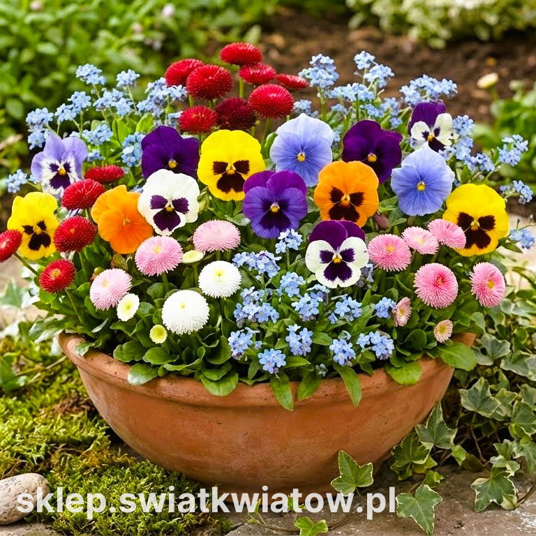 W skład zestawu wchodzą 3 odmiany nasion kwiatów: bratek wielkokwiatowy - mieszanka, niezapominajka alpejska niebieska, stokrotka pomponette - mieszanka.