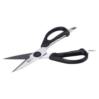 Ostrze wykonane ze stali nierdzewnej a rączki z tworzywa sztucznego w kolorze czarnym. Na ich końcu, praktyczny zamek – zabezpieczenie przed otwieraniem się nożyc w szufladzie. Ergonomiczny kształt i gwarancja bezpieczeństwa użytkowania to cechy oferowanego produktu.