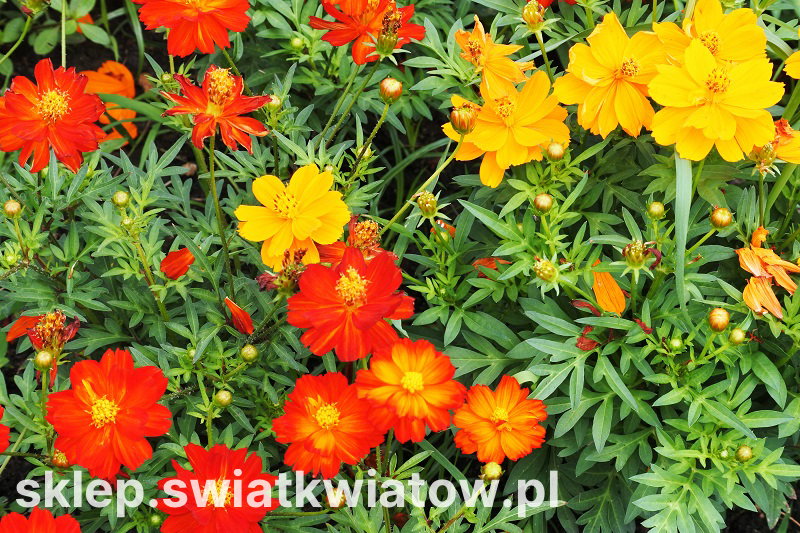 Onętek Lichterfest (Cosmos sulphuru) to roślina o delikatnym, zwiewnym wyglądzie, która dorasta do wysokości 60-80 cm. Smukłe łodygi zdobią pierzaste liście oraz jaskrawo żółte i pomarańczowe kwiaty. Onętek kwitnie długo i obficie, kwiaty pojawiają się już na początku lata i zdobią nasz ogród, aż do jesieni. Gatunek ten świetnie sprawdza się do kompozycji naturalistycznych i łąk kwiatowych. Na rabatach pięknie prezentuje się w większych grupach, ale też w mieszance z innymi kwitnącymi latem roślinami. Doskonały na kwiat cięty, w wazonie przez długi czas zachowuje świeżość.
