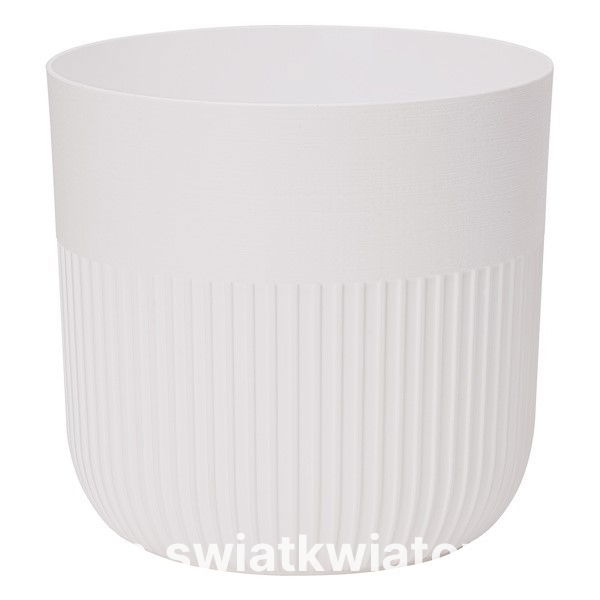 Materiał wykorzystany do produkcji jest trwały oraz odporny na zarysowania, a biała powierzchnia zachowuje swój odcień bez ryzyka żółknięcia pod wpływem światła. Dzięki pionowym żłobieniom osłonka prezentuje się wyjątkowo szlachetnie, skutecznie maskując doniczkę produkcyjną i zapewniając stabilność umieszczonej w niej roślinie. Tworzywo jest w pełni wodoodporne, co skutecznie chroni powierzchnię mebli przed wilgocią.