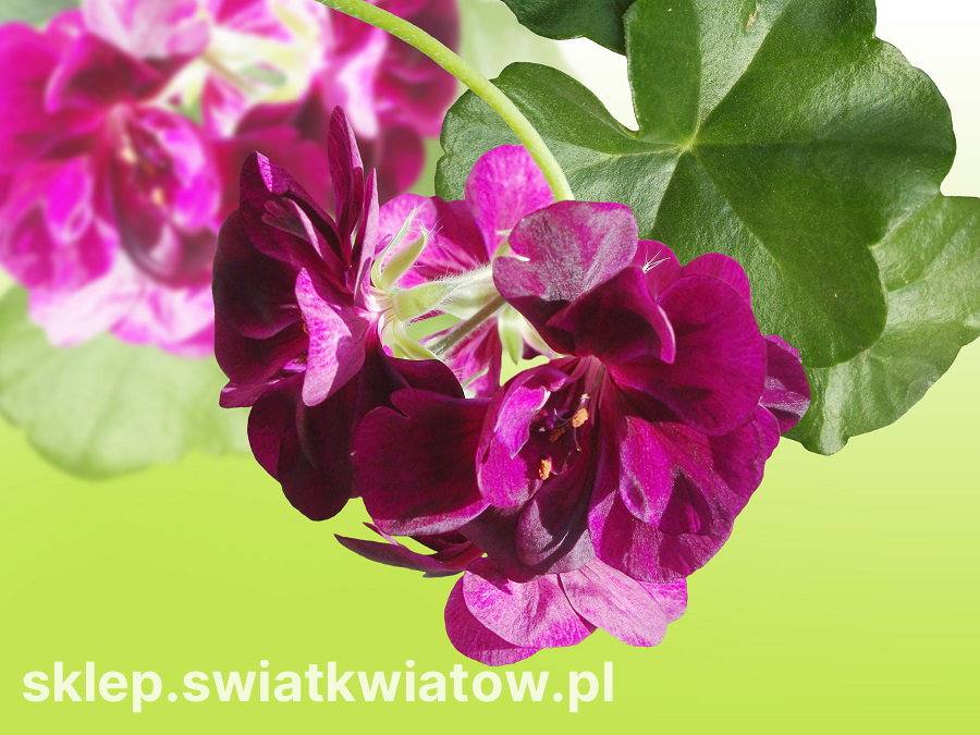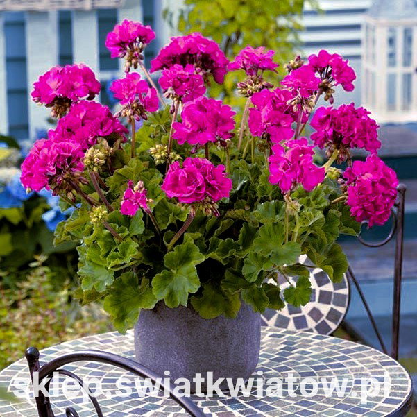 Pelargonia fioletowa (Pelargonium zonale) to oryginalna odmiana gatunku znanego i kochanego od lat. Jej rozgałęzione górą pędy, długie na 25-30 cm, formują zwarte krzaczki. Niemal idealnie kuliste, okazałe kwiatostany, rozwijające się w otoczeniu ozdobnych, okrągłych liści, wyglądają jak prześliczne bukiety. Ich intensywny, fioletowy kolor wyróżnia je spośród najpopularniejszych odmian o czerwonych, różowych i białych kwiatach.