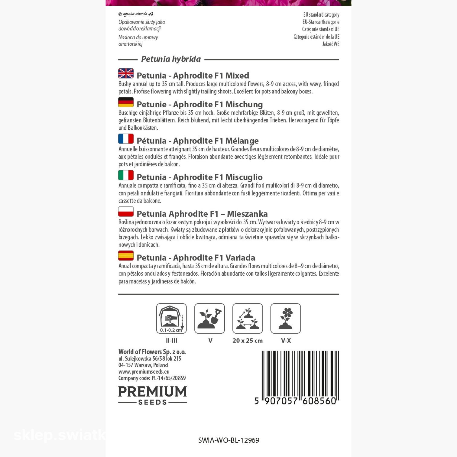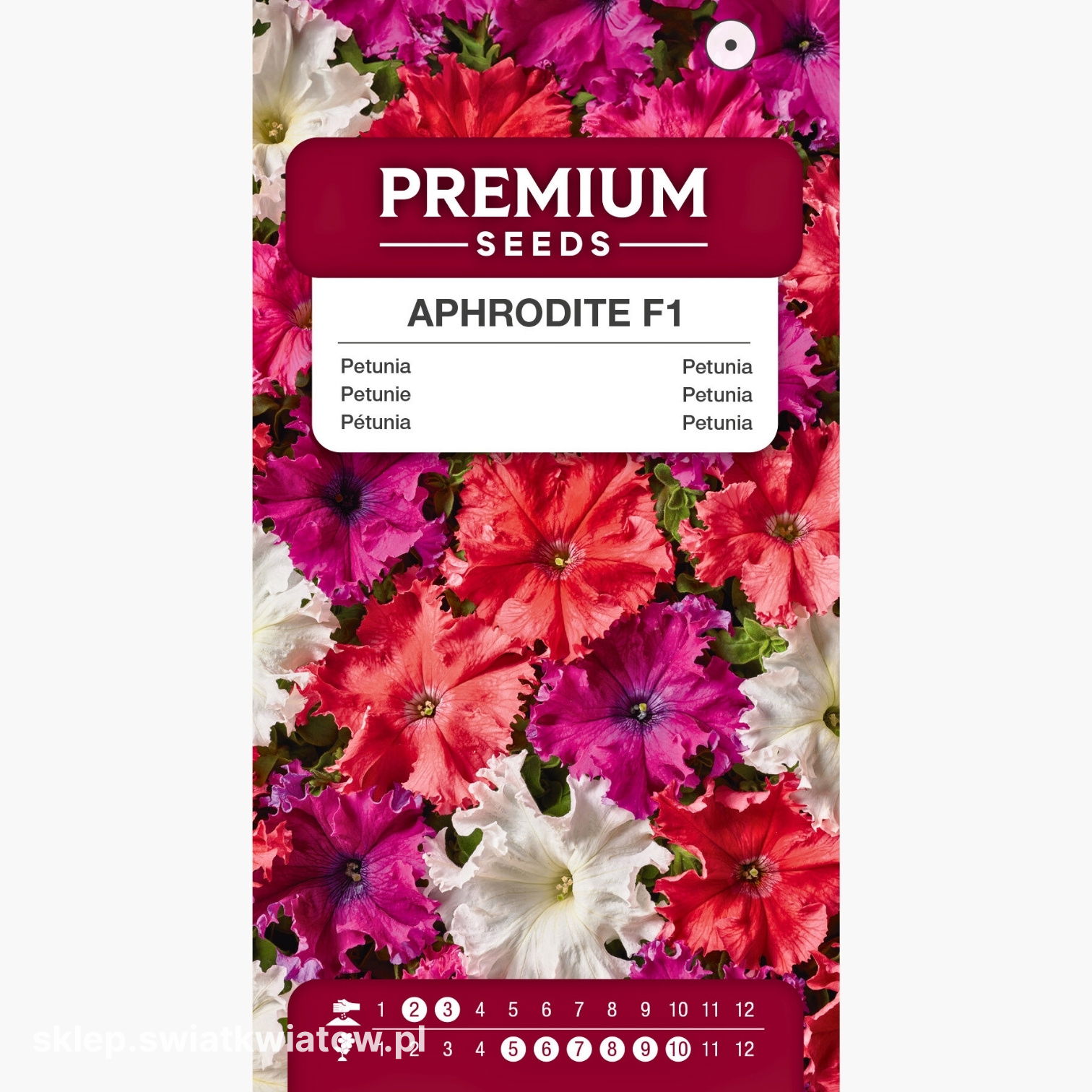 Petunia Aphrodite F1 - Mix to odmiana wyróżniająca się dużymi, efektownymi kwiatami o fantazyjnie pofalowanych i delikatnie karbowanych brzegach oraz szeroką gamą barw typowych dla serii Aphrodite. Roślina tworzy zwarte, eleganckie kępy z lekko przewieszającymi się pędami, które dodają kompozycjom lekkości. Dorasta do około 35 cm i przez cały sezon obficie kwitnie, dzięki czemu donice, skrzynki balkonowe i rabaty zyskują trwały, dekoracyjny wygląd bez skomplikowanej pielęgnacji.