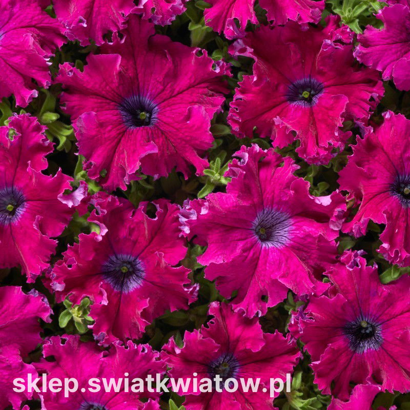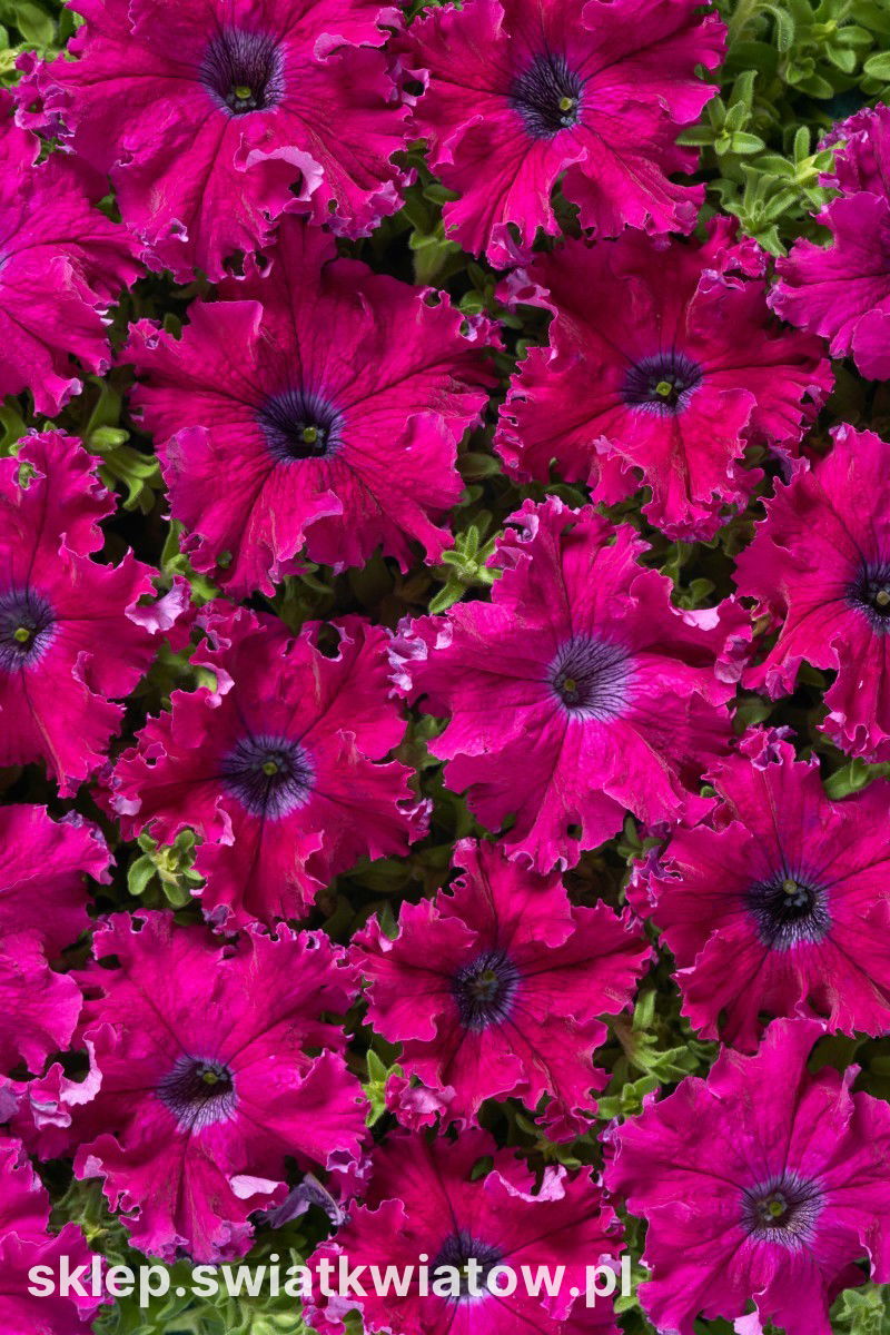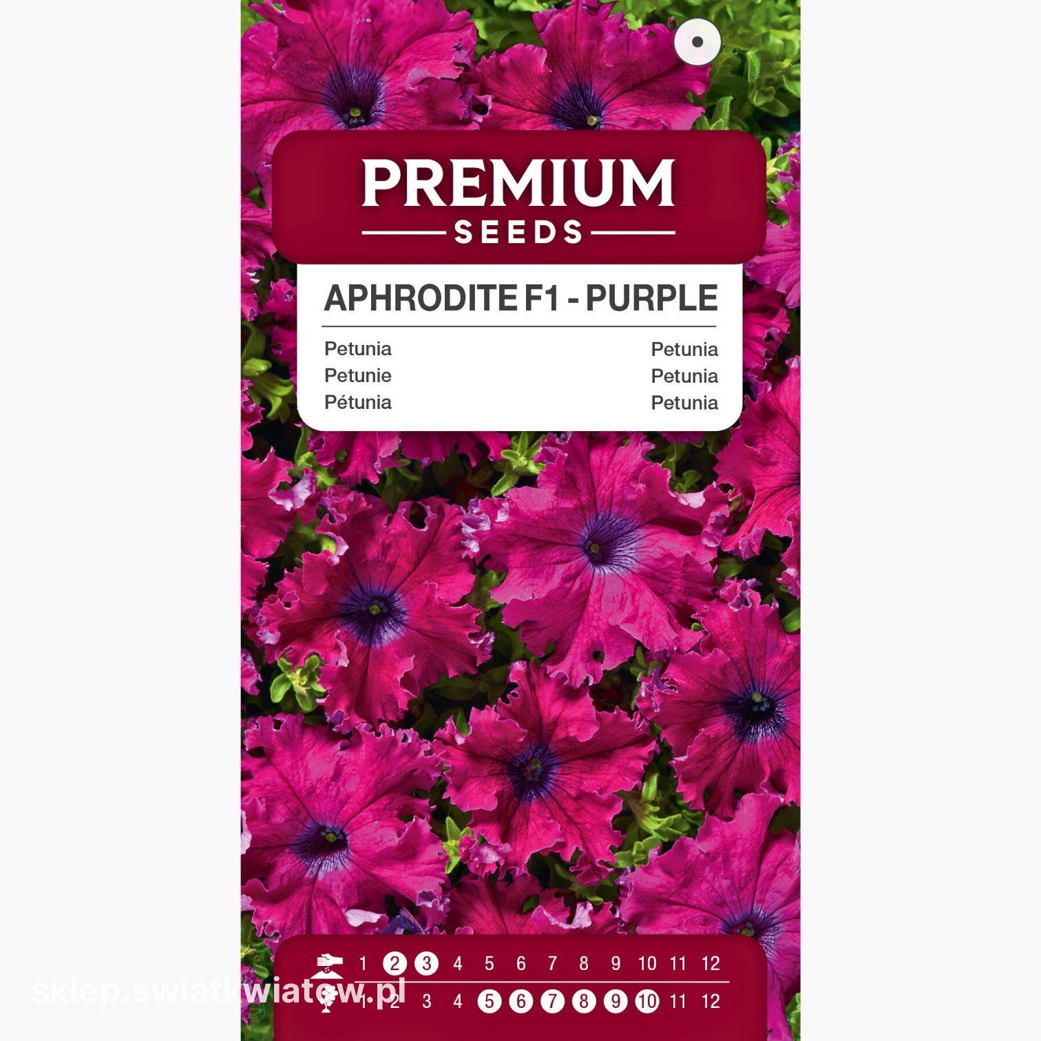 Petunia Aphrodite F1 - Purple to jednoroczna odmiana o dużych, fioletowych kwiatach osiągających 8-9 cm średnicy. Płatki mają delikatnie faliste, lekko postrzępione brzegi, co nadaje kwiatom elegancki, ozdobny charakter. Roślina tworzy zwarte kępy z pędami delikatnie przewieszającymi się na boki, dzięki czemu dobrze prezentuje się zarówno w pojemnikach, jak i na rabatach. Odmiana cechuje się długim okresem kwitnienia i stabilnym wzrostem, dlatego łatwo uzyskać wyraźny efekt dekoracyjny już na początku sezonu.