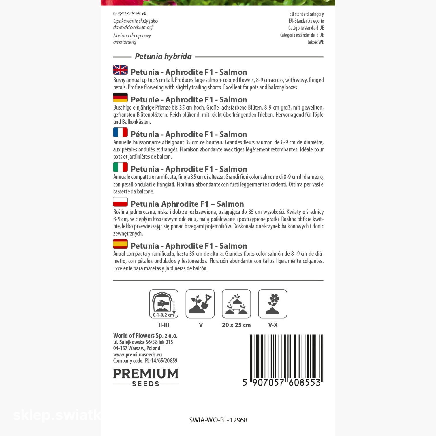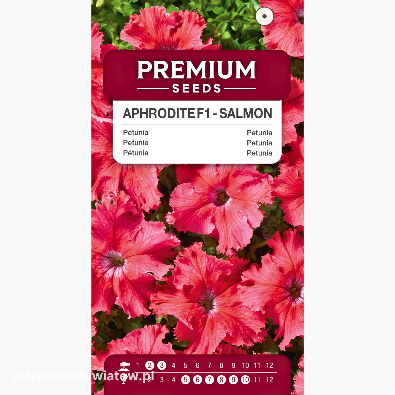 Petunia Aphrodite F1 - Salmon to jednoroczna odmiana wyróżniająca się dużymi kwiatami o łososiowej barwie, z delikatnie falistymi i lekko postrzępionymi brzegami. Kwiaty mają subtelny, elegancki charakter i dobrze prezentują się zarówno w uprawie pojemnikowej, jak i na rabatach. Roślina tworzy zwarte, gęste kępy, a jej lekko przewieszające się pędy sprawiają, że równie dobrze sprawdza się w skrzynkach balkonowych i wiszących pojemnikach. Odmiana jest niewymagająca, co pozwala uzyskać trwały efekt dekoracyjny bez konieczności skomplikowanej pielęgnacji.