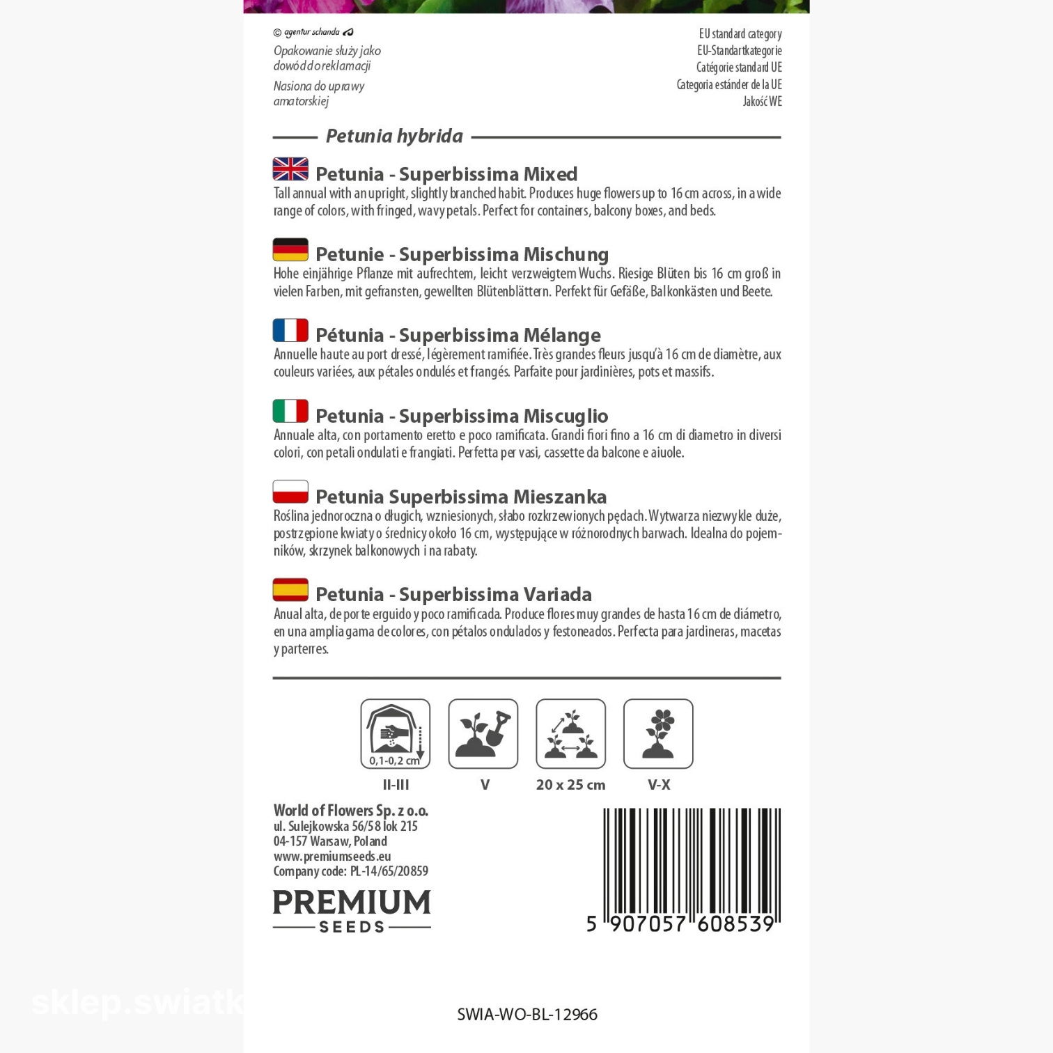 Petunia Superbissima Mix to jednoroczna odmiana zwracająca uwagę bardzo dużymi, dekoracyjnymi kwiatami o falistych i delikatnie frędzlowanych brzegach. Pojedyncze kwiaty mogą osiągać nawet 16 cm średnicy, dzięki czemu roślina stanowi wyrazisty akcent na balkonach, tarasach i rabatach. Odmiana ma wzniesiony, lekko rozkrzewiony pokrój i sprawdza się zarówno w uprawie pojemnikowej, jak i w kompozycjach ogrodowych. Jeśli szukasz kwiatów, które zwrócą na siebie uwagę i dodadzą Twojej przestrzeni wyjątkowego charakteru, ta odmiana spełni Twoje oczekiwania.