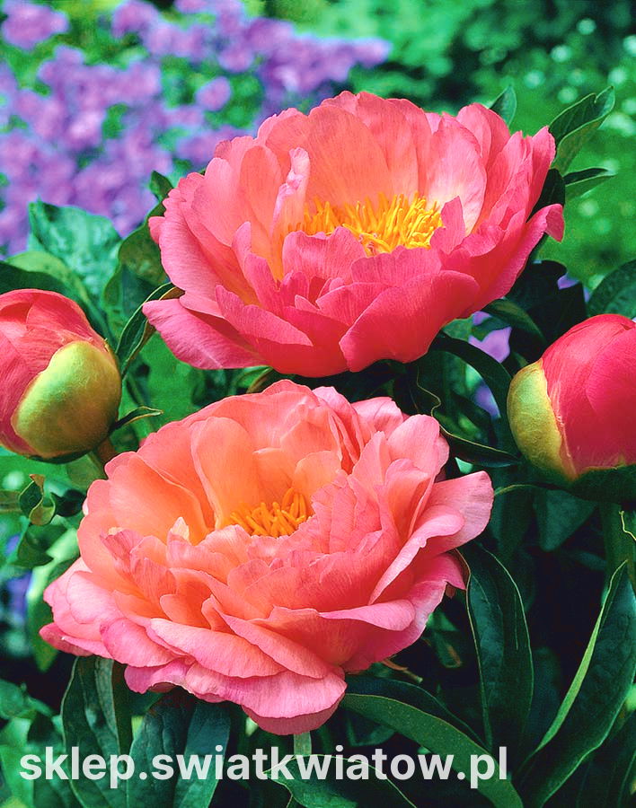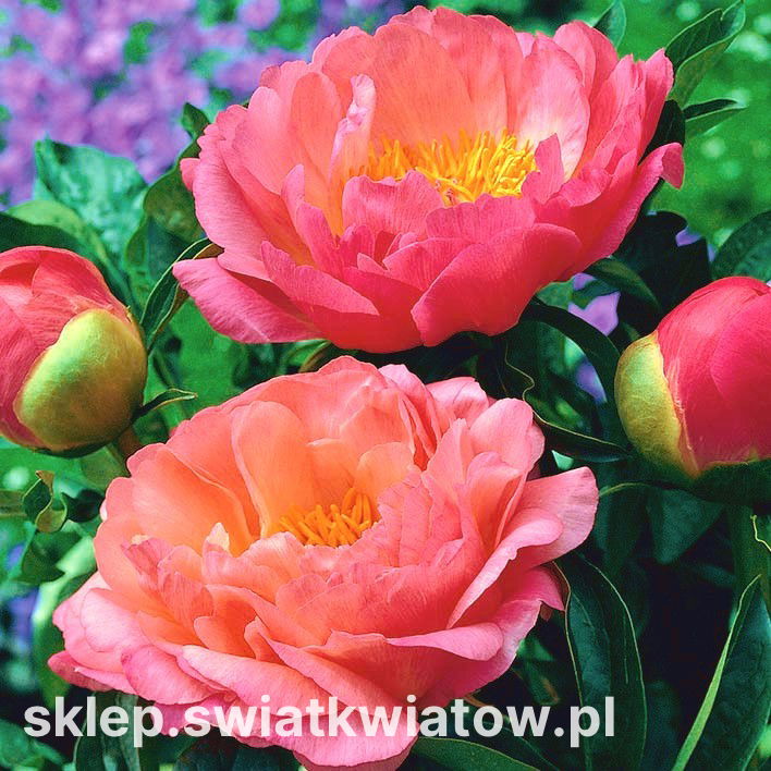 Piwonia, Paeonia - Coral Sunset to ekskluzywna odmiana piwonii o oryginalnym kolorze kwiatów. Wysoka, osiągająca 80-90 cm peonia jest pełna majestatycznego wdzięku. Ta iście królewska bylina ogrodowa pyszni się dużymi, miseczkowatymi kwiatami. Kolorystyka kwiatu w odcieniach pomarańczowo – różowych. W trakcie kwitnienia stopniowo ujawniają się również żółte tony. Środek kwiatu wypełniony jest przez liczne pręciki, otulone wieloma okółkami satynowych płatków. Kwiaty wydają subtelny, bardzo przyjemny zapach. Roślina jest atrakcyjna również poza sezonem, dzięki eleganckim, pierzastym liściom w głębokim szmaragdowym kolorze. Ta niezwykła odmiana jest prawdziwym skarbem ogrodu. Wspaniałe, wzniesione pędy, zakończone ogromnymi kwiatami to widok wprost bajeczny. Peonia Coral Sunset jest okazem, który doskonale zaprezentuje się jako pojedyncza roślina, wyeksponowana na tle trawnika. Jest genialna jako część rabaty czy kwietnika. Świetnie wygląda w otoczeniu krzewów kwitnących. Kwiaty piwonii są bardzo trwałe i warto ścinać je do wazonu.