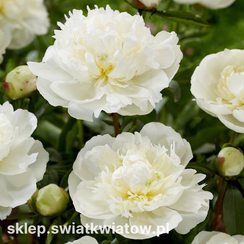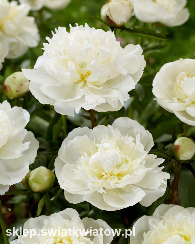 Piwonia, Paeonia Duchesse de Nemours to popularna i ceniona odmiana o śnieżnobiałych kwiatach. Imponująca średnica około 15-20 cm jest wynikiem połączenia szerokich płatków u podstawy kwiatu i węższych występujących na środku. Dodatkowo kopulasty pompon jest delikatnie pofalowany, co dodaje mu objętości. Piękna, klasyczna biel w pełni kwitnienia zostaje przełamana lekkim odcieniem żółtozielonego. Plusem odmiany jest wytwarzanie subtelnego zapachu, który otula kwiaty. Tłem dla białych, prawie kulistych kwiatów są skórzaste, ciemnozielone liście o mocno powcinanych blaszkach. Prezentowana odmiana dorasta do około metrowej wysokości. Łodygi tej fenomenalnej rośliny są sztywne, lecz hojnie obdarzone kwiatami mogą wymagać podpór. Jasne, delikatne kwiaty świetnie poprawiają strukturę kompozycji, nadają im lekkości i świeżości. Paeonia Duchesse de Nemours wspaniale komponuje się z innymi odmianami, z łatwością łączy się z różnymi rodzajami roślin. Jest to jedna z czołowych odmian uprawianych na kwiat cięty.