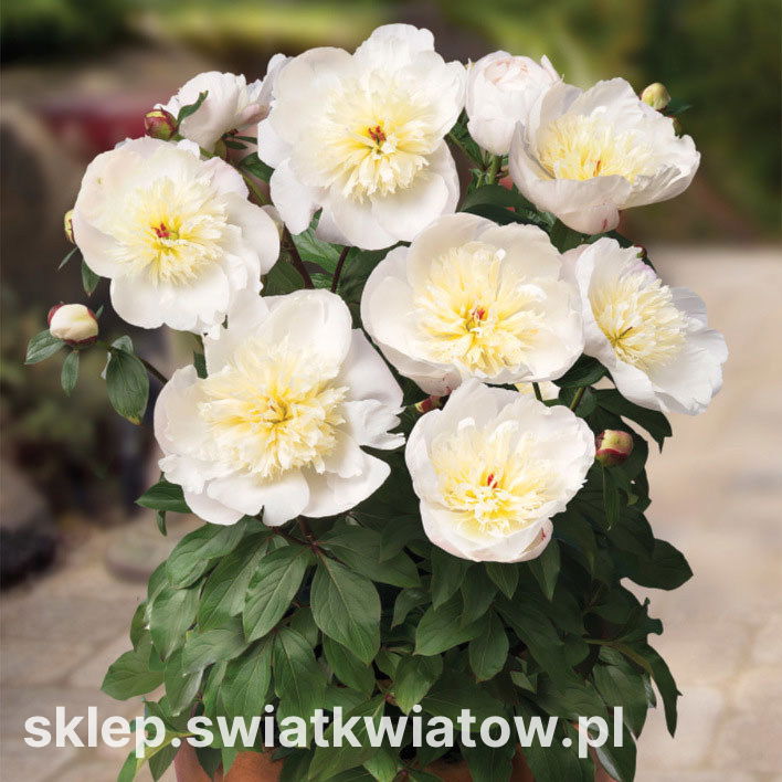 Piwonia, Paeonia – Patio Madrid – niska, doniczkowa (Paeonia) jest uroczą, niedużą byliną o pokroju kępkowym i kwiatach w gustownym, kremowo-białym kolorze. Oferowana odmiana dorasta przeciętnie do 50-60 cm, dlatego jest polecana do uprawy doniczkowej w widnych pomieszczeniach, na balkonach, tarasach i w zakątkach wypoczynkowych w ogródku. Zwarty krzaczek, udekorowany od lipca do sierpnia dużymi kwiatami w postaci miseczek, będzie prezentował się czarująco również na rabacie. Kwiatostan delikatnej peonii Patio Madrid składa się z kremowożółtych kwiatów rurkowatych, tworzących półkulisty środek, oraz otaczających je zwartym pierścieniem szerokich płatków w kolorze śnieżnobiałym. Dzięki stonowanym kolorom odmiana ta wspaniale odnajduje się w aranżacjach z jaskrawo wybarwionymi, niskimi kwiatami jednorocznymi, takimi jak bratek ogrodowy, begonia wiecznie kwitnąca i celozja pierzasta.