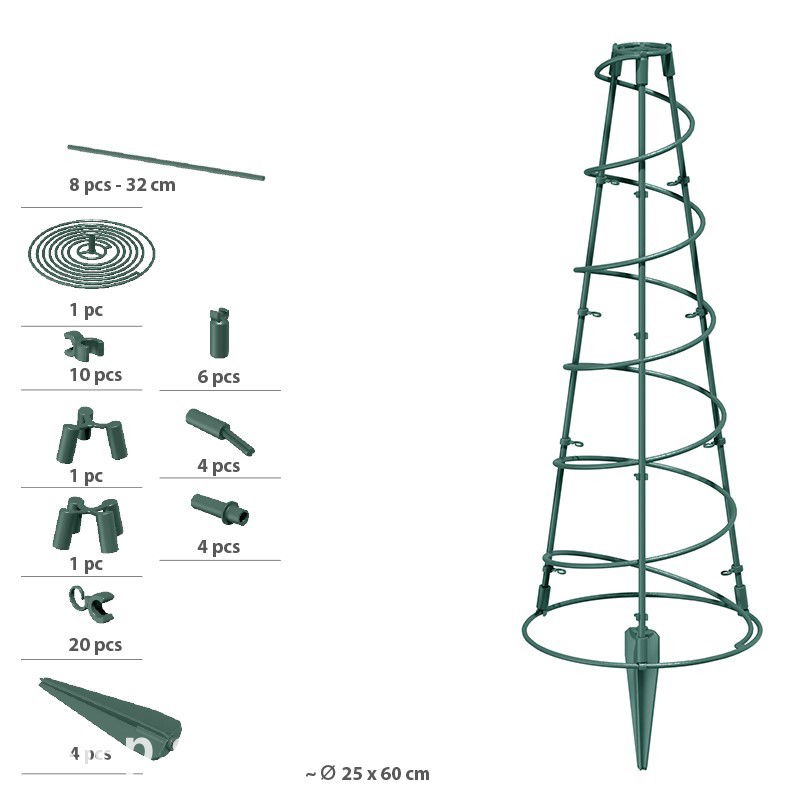Komplet elementów pozwala złożyć dwie konstrukcje podpierające. Pierwsza to stożkowa piramidka na trzech podporach z dodatkową spiralą, która prowadzi pędy po okręgu i nadaje uprawie dekoracyjny charakter. Druga możliwość to piramida bez spirali, przeznaczona do ustawienia w ogrodzie lub w donicy. Taka forma daje roślinom więcej miejsca wewnątrz podpory i dobrze sprawdza się między innymi przy fasoli czy groszku, które potrzebują swobody wzrostu.