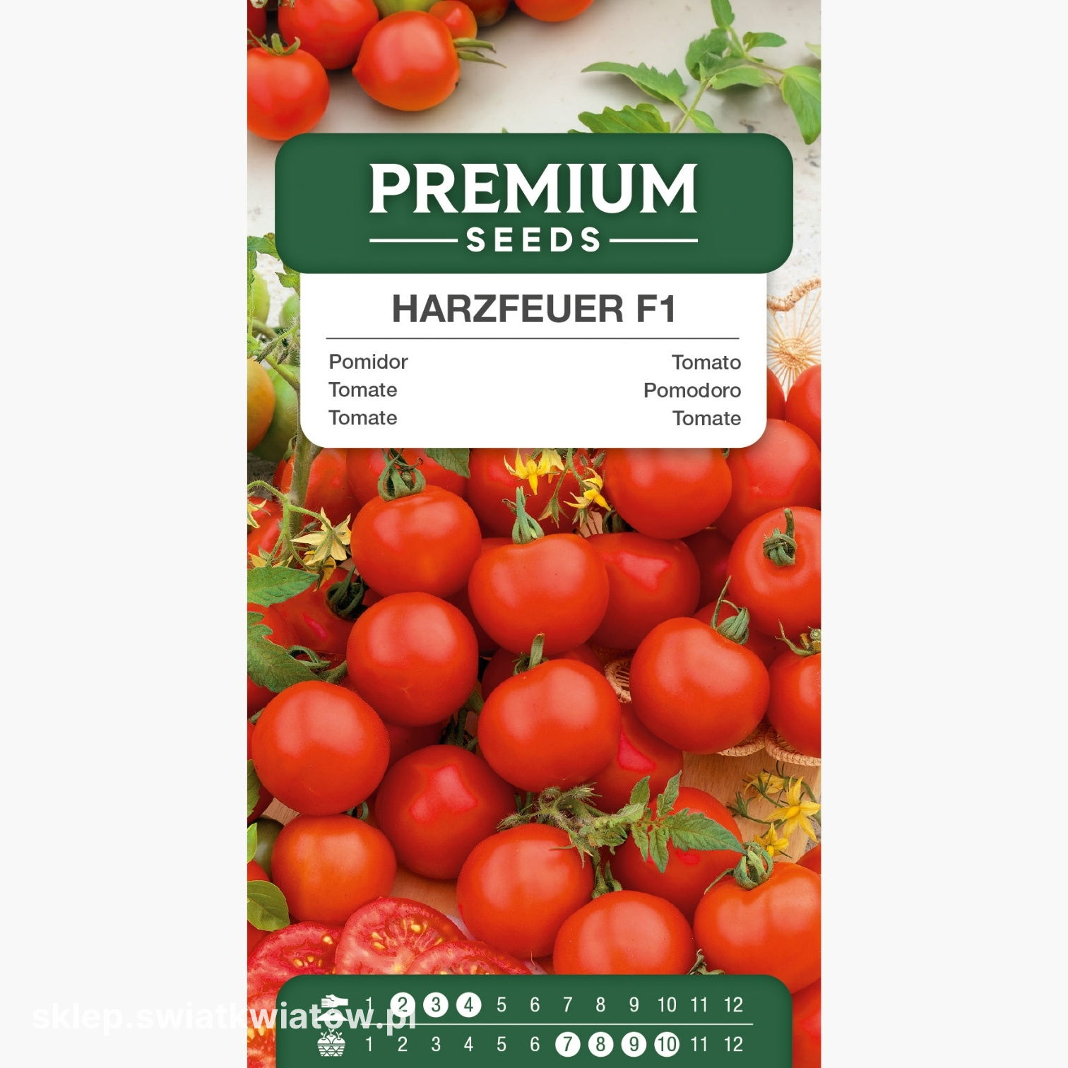 Pomidor Harzfeuer F1 (Solanum lycopersicum) – gruntowy, znany i ceniony w Europie – należy do grupy najwcześniejszych mieszańców heterozyjnych o zwiększonej plenności. Dzięki dobrej odporności na niekorzystne warunki środowiskowe, w tym wahania temperatury, oferowana odmiana nadaje się do sadzenia w odkrytym gruncie (w cieplejszych rejonach kraju). Szczególnie obficie i długo plonuje pod nieogrzewanymi osłonami. Wydaje owoce dorodne, kuliste i pozbawione żebrowania, o mocnej skórce, niepodatnej na pękanie, oraz mięsistym, bardzo słodkim, intensywnie czerwonym miąższu. Pomidory są pozbawione piętki, odporne na przebarwienia i wyborne zarówno na surowo, do kanapek, jak i po przetworzeniu.