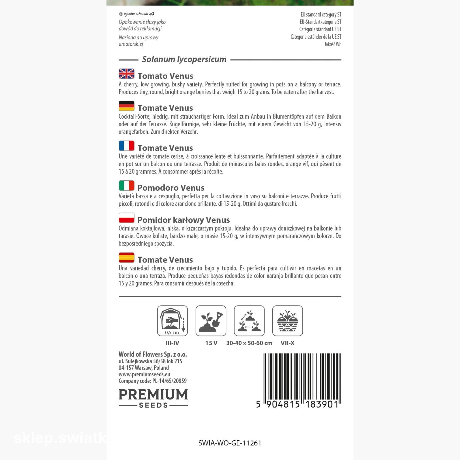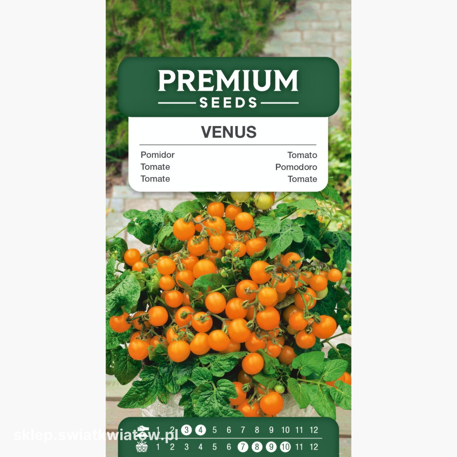 Pomidor Venus to atrakcyjna odmiana koktajlowa, która świetnie sprawdzi się zarówno w ogrodzie, jak i w uprawie balkonowej czy tarasowej. Roślina ma niski, krzaczasty pokrój, dzięki czemu doskonale rośnie w donicach i pojemnikach. Tworzy liczne, intensywnie pomarańczowe owoce o masie 15–20 g, które zachwycają delikatnym smakiem i dekoracyjnym wyglądem. Idealnie nadają się do sałatek, przekąsek i dekoracji dań, wprowadzając na stół odrobinę letniego blasku. Starannie wyselekcjonowane nasiona gwarantują pewną uprawę i obfite plonowanie.