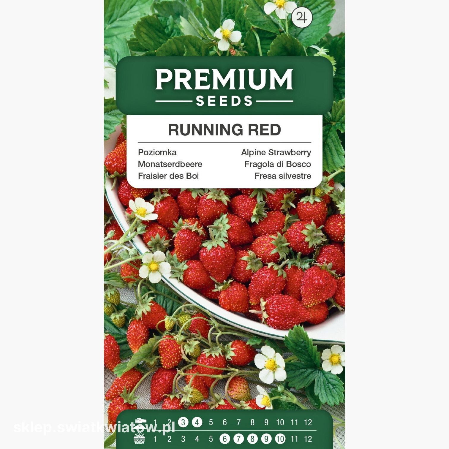 Poziomka Running Red (Fragaria vesca) to niezwykła odmiana, która zachwyca zarówno wyglądem, jak i smakiem. Jej zwisające pędy osiągają nawet 1,5 metra długości, tworząc olśniewającą, kaskadową kurtynę zieleni i czerwieni. Roślina dorasta do ok. 20 cm wysokości, ale dzięki licznym, długim rozłogom rozrasta się wyjątkowo bujnie. To prawdziwa ozdoba balkonów, tarasów i ogrodów w pojemnikach - idealna do koszy wiszących, gdzie każdy pęd pełen kwiatów i owoców stworzy dekorację, obok której trudno przejść obojętnie. Running Red to połączenie urody i użyteczności - przez cały sezon cieszy oko pięknym pokrojem, a podniebienie słodyczą intensywnie czerwonych, pachnących owoców.