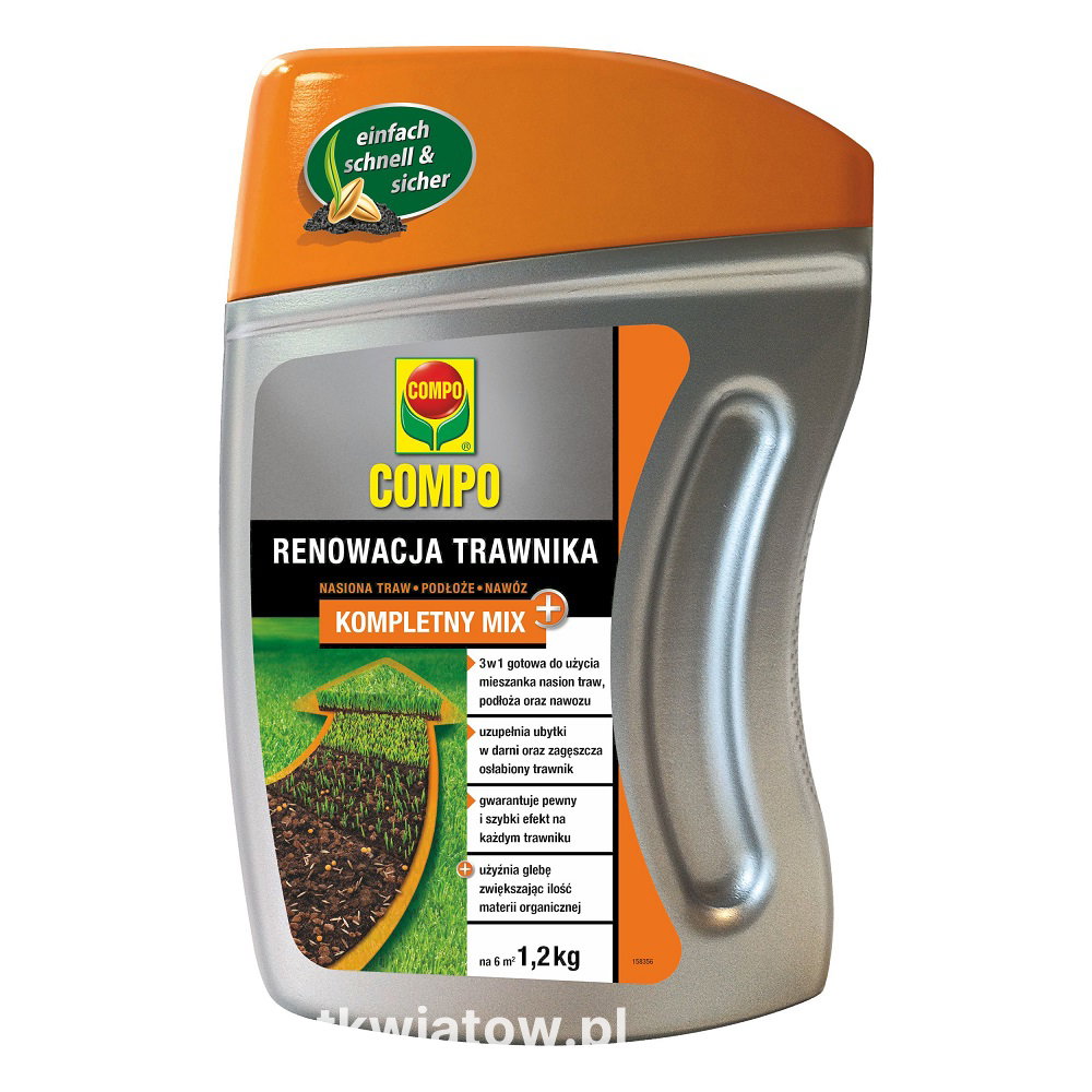 W opakowaniu znajduje się 1,2 kg kompletnego zestawu Compo złożonego z mieszanki nasion, podłoża i nawozu. Taka ilość wystarcza średnio na uzupełnienie ubytków o całkowitej powierzchni 3 m2 lub renowację/zagęszczenie 6 m2 trawnika.