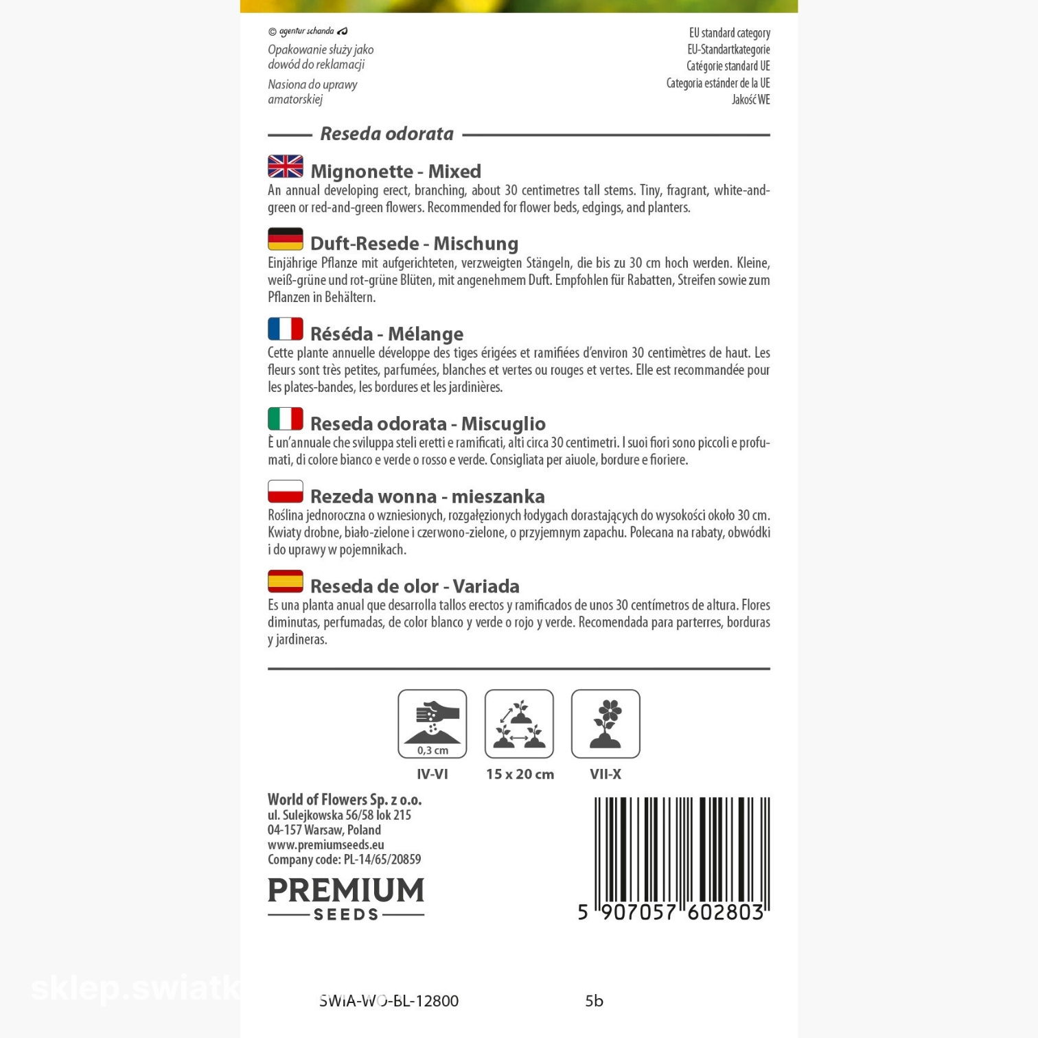 W opakowaniu znajduje się 2 g nasion. Na odwrocie torebki znajdują się podstawowe informacje o roślinie i jej uprawie oraz termin przydatności nasion do wysiewu.