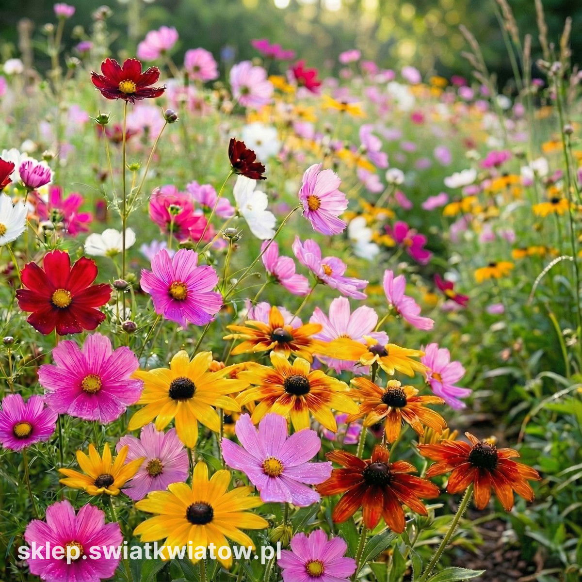 W skład zestawu wchodzą 2 gatunki nasion kwiatów: rudbekia niska - mieszanka, onętek, Kosmos - mieszanka.