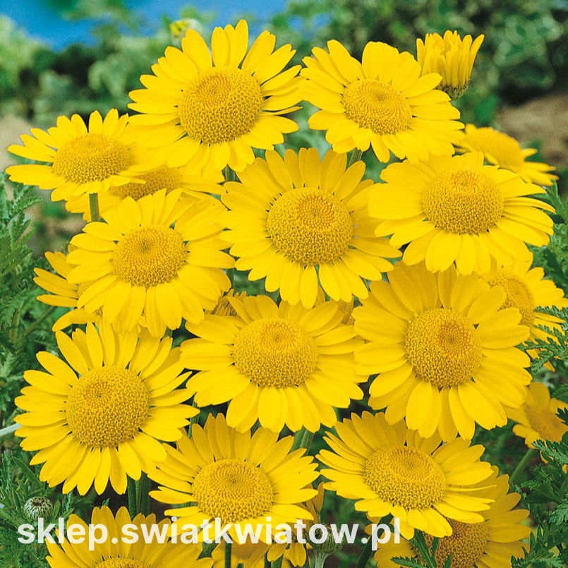 Rumian żółty (Anthemis tinctoria) to atrakcyjna bylina, która łączy dekoracyjność z wyjątkową odpornością. Tworzy zwarte, silnie rozkrzewione kępy o wysokości 60–80 cm, oraz pierzaste, lekko postrzępione liści, zielone od góry i delikatnie szarawe od spodu. Latem na szczytach długich pędów rozwijają się intensywnie żółte koszyczki kwiatowe przypominające stokrotki. Rumian nie tylko pięknie prezentuje się na rabatach i skarpach, ale także emanuje przyjemnym, ziołowym zapachem. Jego naturalna odporność i niewielkie wymagania glebowe sprawiają, że doskonale sprawdza się w ogrodach skalnych oraz na suchych, mocno nasłonecznionych stanowiskach.