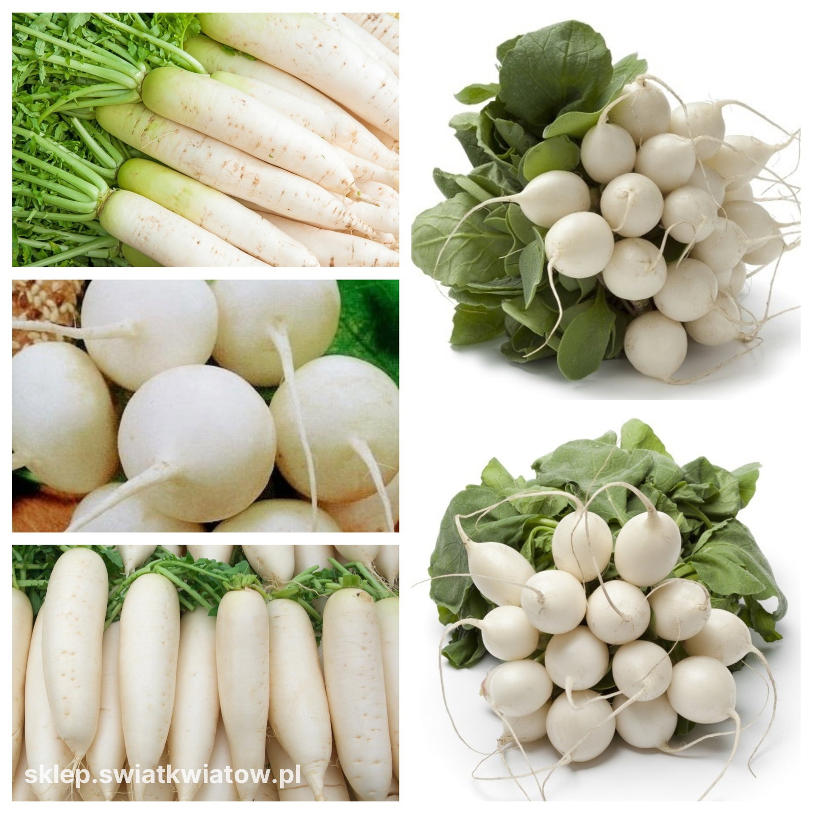 W skład zestawu wchodzi 5 odmian nasion rzodkiewki białej: Sopel Lodu; Afrodyta; Śnieżka; Leda; Tondo Bianco.