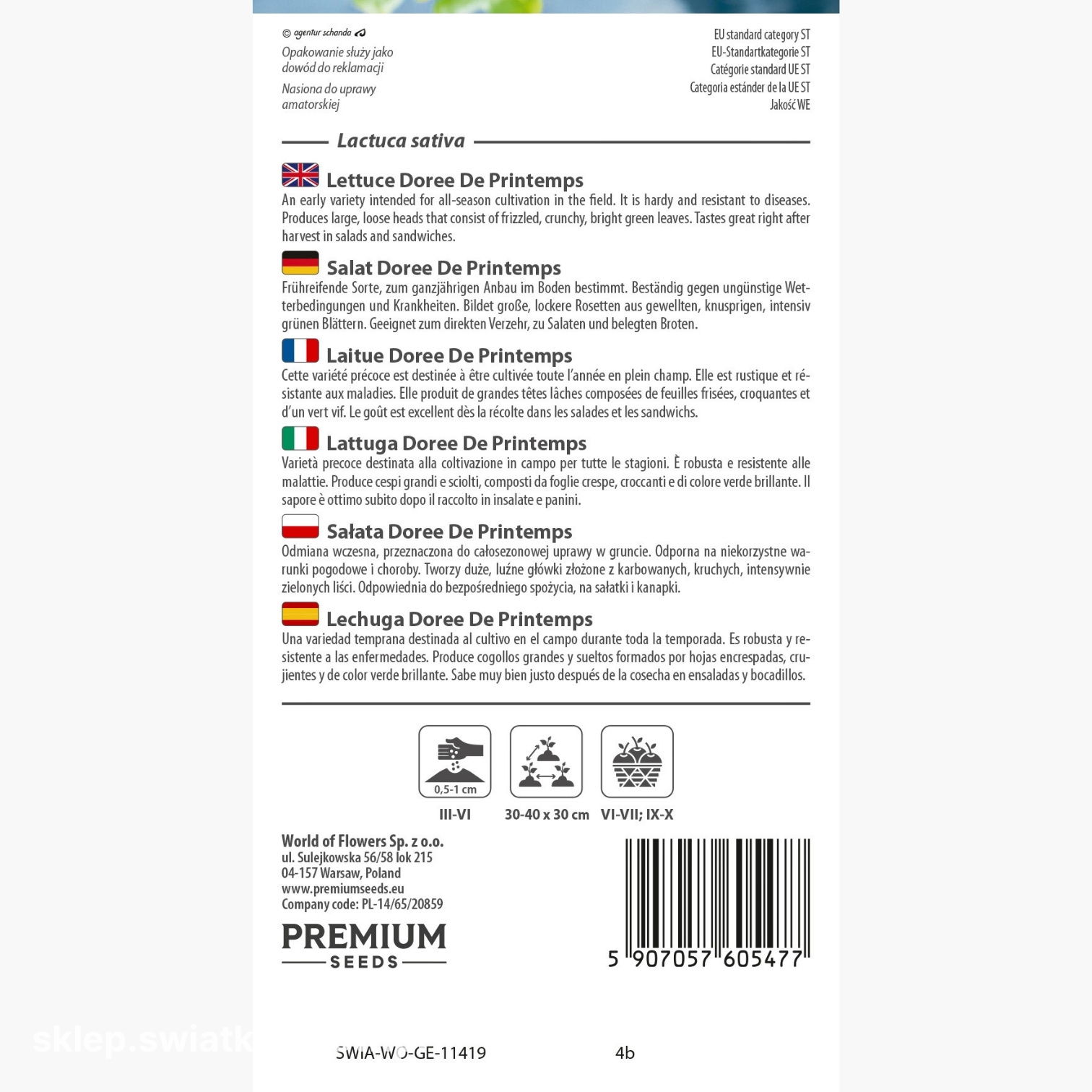 Wybierając nasiona w Sklepie Świat Kwiatów, zyskujesz gwarancję jakości i świeżości. Każda partia nasion jest dokładnie testowana w warunkach laboratoryjnych, aby zapewnić wysoką zdolność kiełkowania. Dzięki starannemu pakowaniu w odpowiednich warunkach wilgotności i temperatury, nasiona trafiają do Ciebie w idealnym stanie. Sklep oferuje szybą wysyłkę, fachowe doradztwo i wsparcie w doborze odmian. Kupując u nas, wybierasz sprawdzone źródło, które od lat cieszy się zaufaniem ogrodników w całej Polsce. Doree de Printemps z pewnością stanie się ozdobą Twojej grządki i źródłem zdrowych, smacznych liści dla całej rodziny.