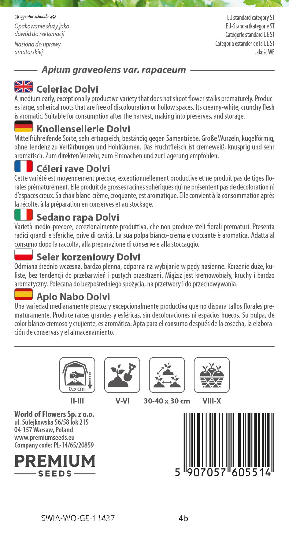 W każdej paczce znajduje się 0,5 g nasion selera korzeniowego Dolvi. Opakowanie zawiera informacje o zasadach uprawy oraz o terminie przydatności nasion do siewu.