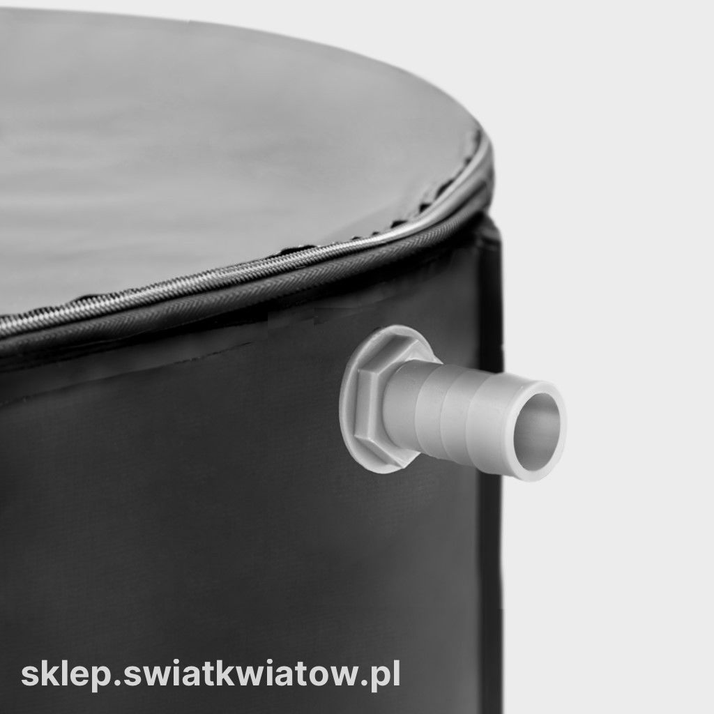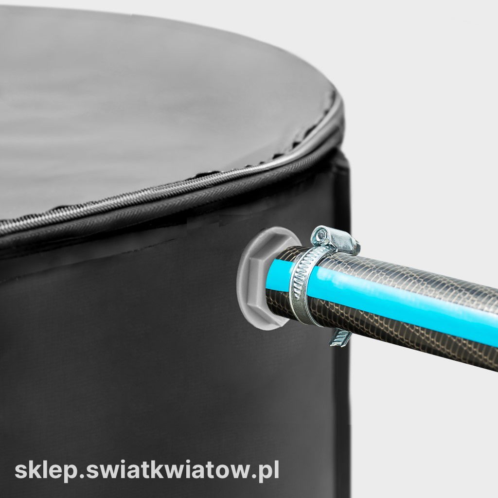 Konstrukcja umożliwia prosty montaż bez użycia skomplikowanych narzędzi. Górne przyłącze pozwala na wprowadzenie wody do wnętrza. Po sezonie zbiornik można szybko zdemontować i schować.
