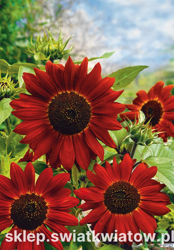 Słonecznik ozdobny Velvet Queen to efektowna odmiana jednoroczna, wyróżniająca się intensywnie czerwono-brązowymi kwiatami o aksamitnym wykończeniu. Dzięki oryginalnemu ubarwieniu i mocnym, sztywnym łodygom roślina doskonale sprawdza się zarówno w kompozycjach ogrodowych, jak i jako kwiat cięty. Osiąga wysokość od 100 do 150 cm, co nadaje jej majestatycznego charakteru i pozwala na zastosowanie w tylnej części rabat, jako tło dla niższych roślin.
