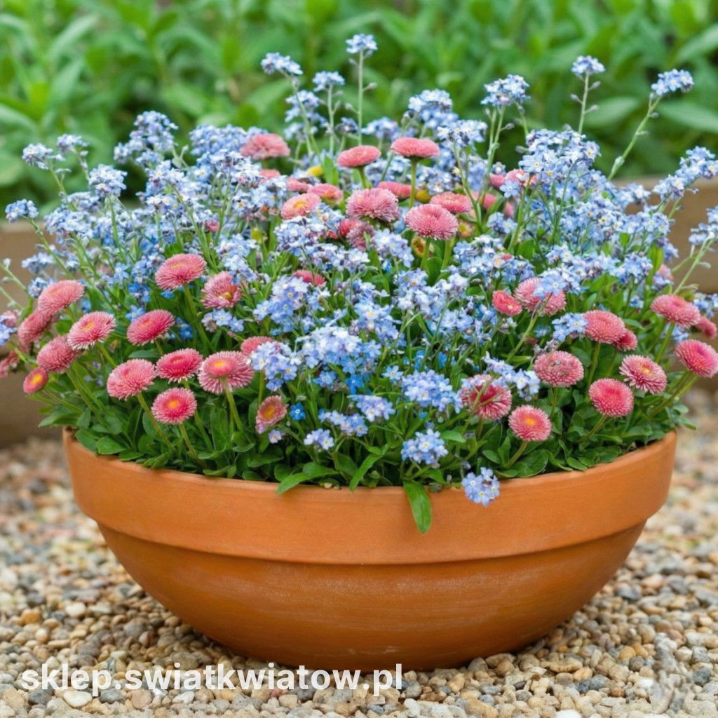 W skład zestawu wchodzą 2 gatunki nasion kwiatów: niezapominajka alpejska niebieska oraz stokrotka pomponette różowa.