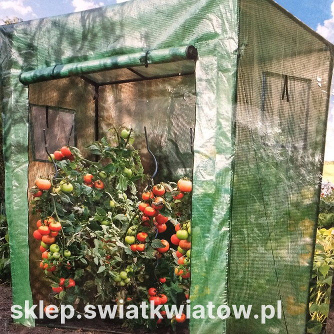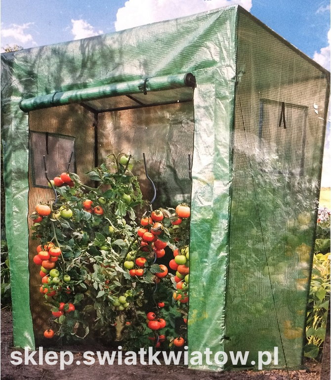 Szklarnia do pomidorów to produkt najwyższej jakości, wykonany z trwałych i wytrzymałych na różne warunki klimatyczne tworzyw. Składa się z metalowej ramy epoksydowej o średnicy 18 mm i pokryta jest w pełni odporną na promieniowanie UV osłoną polietylenową o gęstości 145 g/m2. Produkt został wyposażony w mocowania, które łatwo przytwierdzić do gruntu, by uzyskać jego pełną stabilizację. Osłona PE posiada 3 okna (w tym 1 wejście), które pozwalają na właściwą wentylację szklarni. Otwiera się je za pomocą zamka błyskawicznego. Na powierzchni użytkowej 1,54 m2 można pomieścić kilka krzaków pomidora, papryki czy oberżyny.
