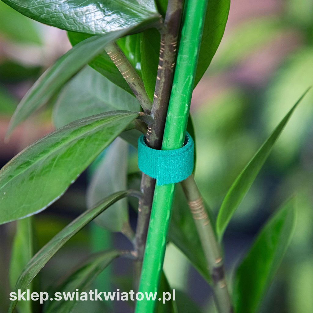 Mechanizm rzepowy pozwala zapiąć taśmę dokładnie na taką średnicę, jakiej potrzebujesz. W razie przyrostu rośliny możesz szybko odpiąć taśmę i zapiąć ją ponownie, bez wymiany materiału. To ułatwia pielęgnację i pomaga utrzymać roślinę w stabilnej pozycji.