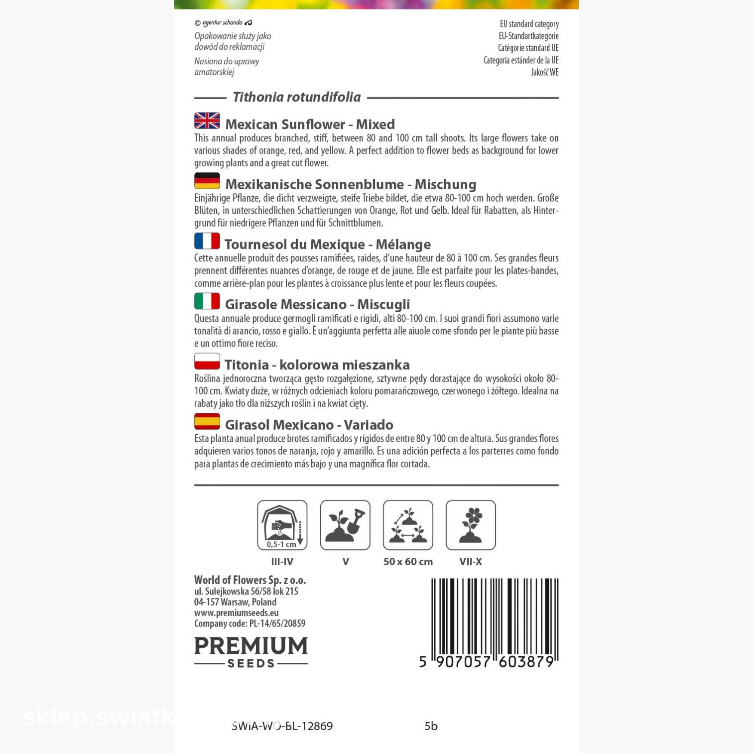 Opakowanie zawiera 0,5 g nasion. Na opakowaniu znajdziesz informacje o zasadach uprawy i terminie przydatności do wysiewu.