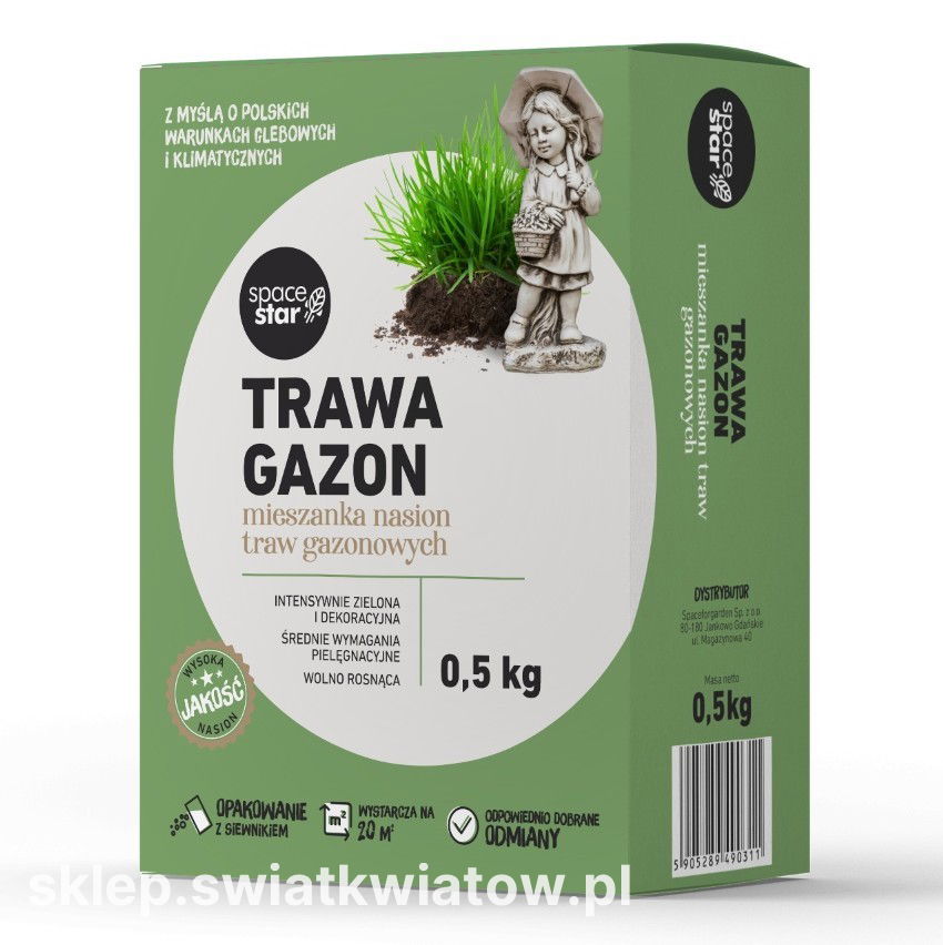 Trawa Gazon marki Space Star to starannie wyselekcjonowana mieszanka nasion traw gazonowych, stworzona z myślą o polskich warunkach glebowych i klimatycznych. Pozwala ona na uzyskanie wyjątkowo reprezentacyjnej, gęstej murawy, która staje się wizytówką każdego ogrodu. Dzięki tej kompozycji Twój trawnik zyska intensywnie zieloną barwę i elegancki wygląd, stanowiąc idealne tło dla rabat czy krzewów ozdobnych.