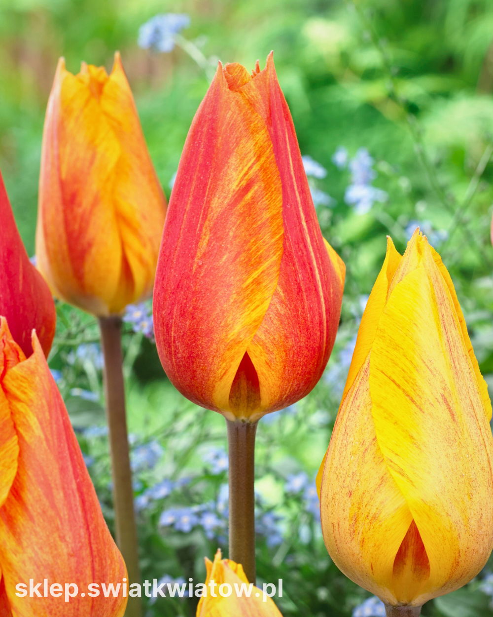 Tulipan El Nino to kwiat o gorącej mieszance barw. Przeplatające się w nieregularnych, jakby malowanych pędzlem smugach odcienie żółci, pomarańczu i czerwieni zdają się tańczyć na smukłych kielichach kwiatów. Najlepszą cechą tej odmiany jest to, że nie znajdziemy dwóch identycznych kwiatów. Ta niesamowita roślina z daleka przyciąga wzrok. El Nino to odmiana, która zawładnie sercem osób lubiących jaskrawe, wyraziste akcenty w swoim otoczeniu. Wsparte na mocnych łodygach kwiaty to idealny materiał do planowania nasadzeń na rabatach i do ścinania na bukiety. Docelowa wielkość roślin wynosi około 60 cm. Kwitnienie przypada na koniec kwietnia i początek maja.
