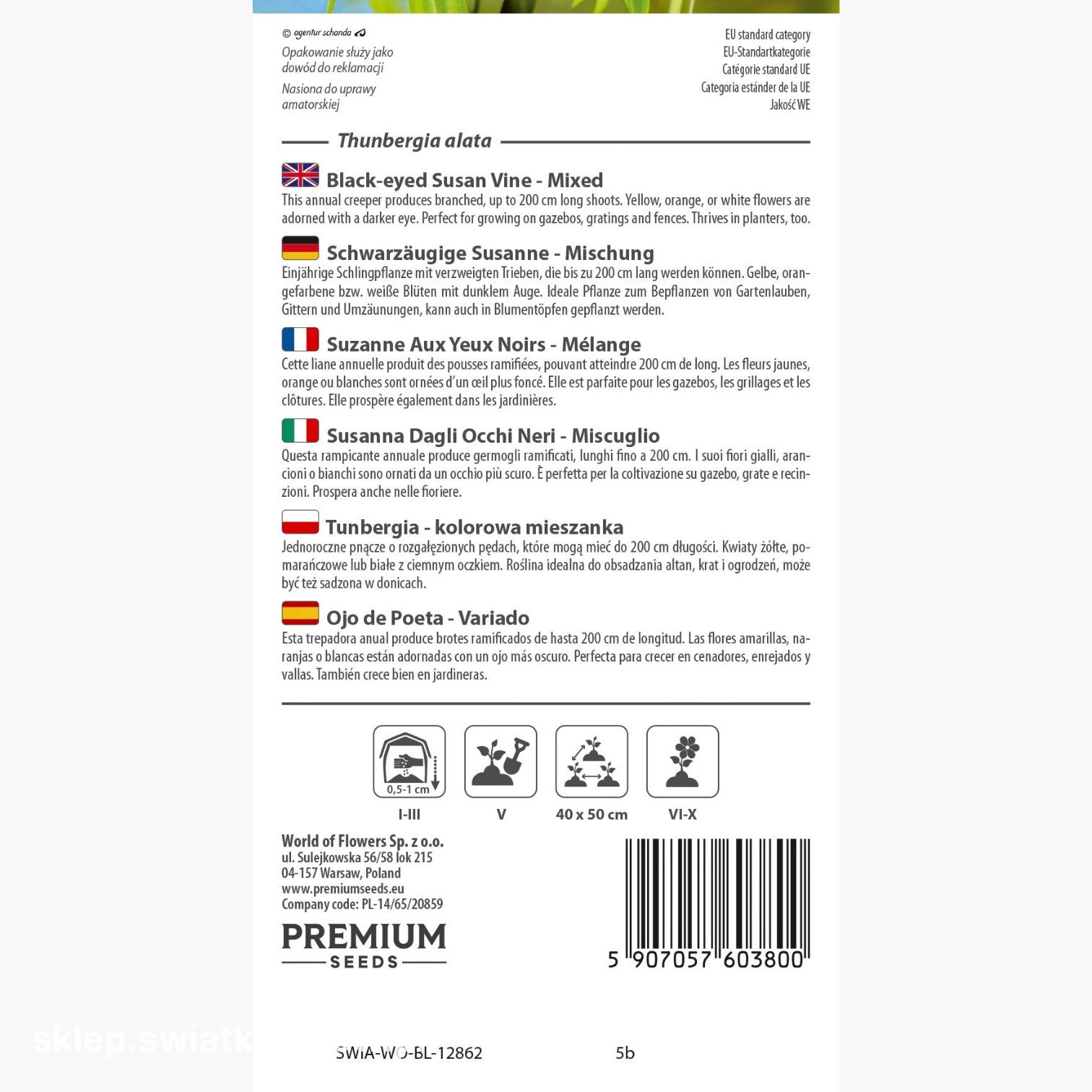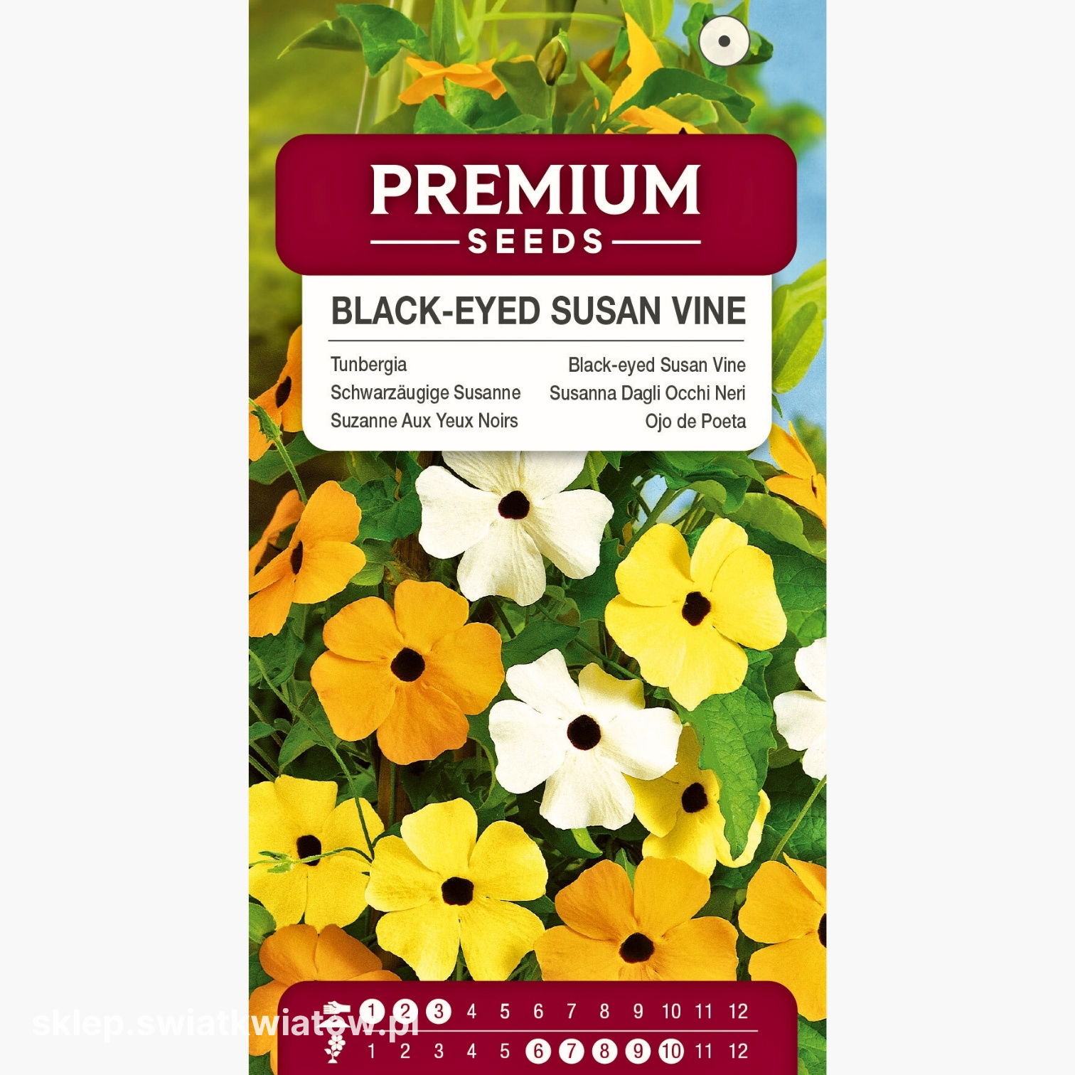 Opakowanie zawiera 0,5 g nasion tunbergii. Na opakowaniu znajdziesz informacje o zasadach uprawy i terminie przydatności do wysiewu.