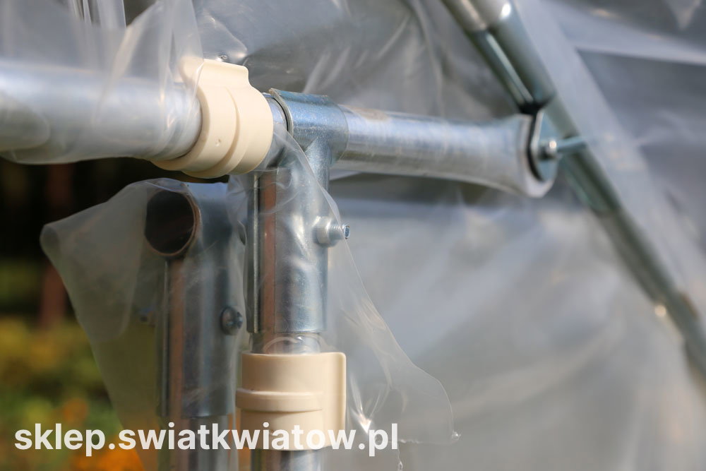 Stabilna konstrukcja oparta na ramie wykonana jest z rur o średnicy 25mm, które zostały zabezpieczone obustronnie przed korozją w procesie cynkowania ogniowego. Pokrycie wykonane z transparentnej folii UV2, która posiada właściwą dla roślin przepuszczalność światła 95% i nie jest podatna na uszkodzenia mechaniczne.