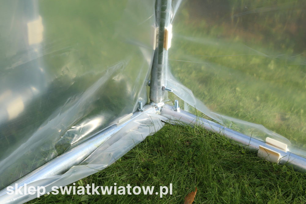 Stabilna konstrukcja oparta na ramie wykonana jest z rur o średnicy 25mm, które zostały zabezpieczone obustronnie przed korozją w procesie cynkowania ogniowego. Pokrycie wykonane z transparentnej folii UV2, która posiada właściwą dla roślin przepuszczalność światła 95% i nie jest podatna na uszkodzenia mechaniczne.