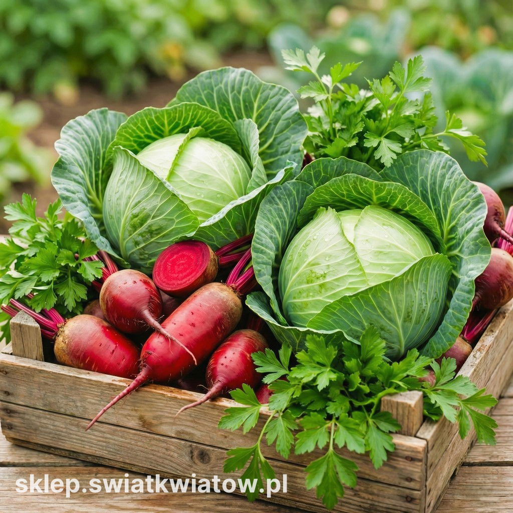 W skład zestawu wchodzą: kapusta głowiasta biała Kamienna Głowa, burak ćwikłowy Cylindra, seler liściowy Gevone Snij.