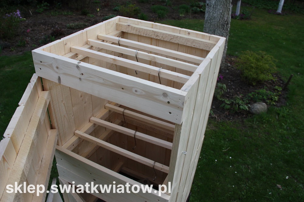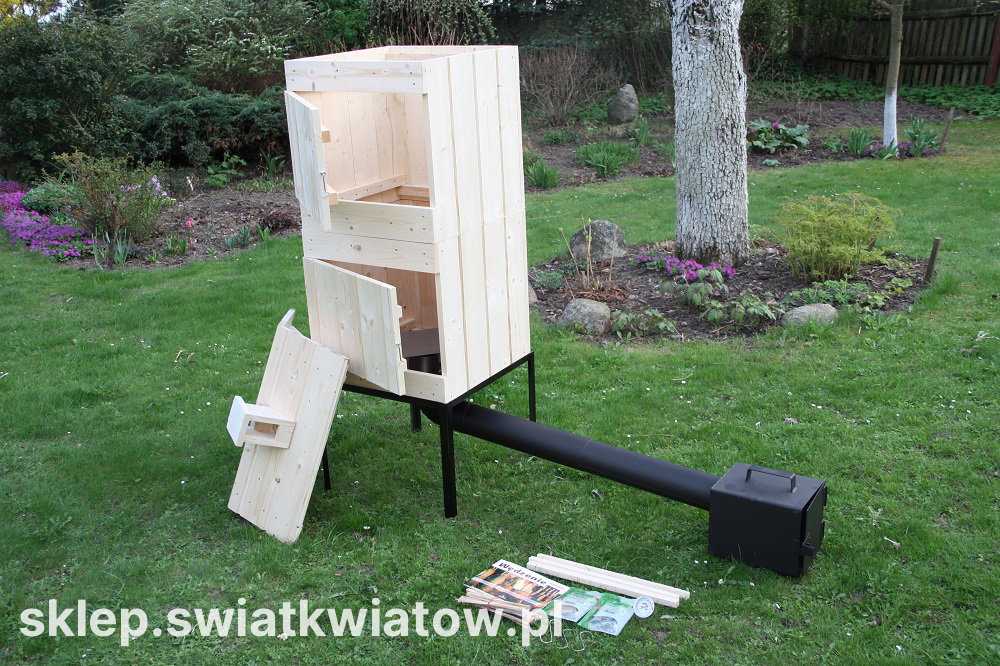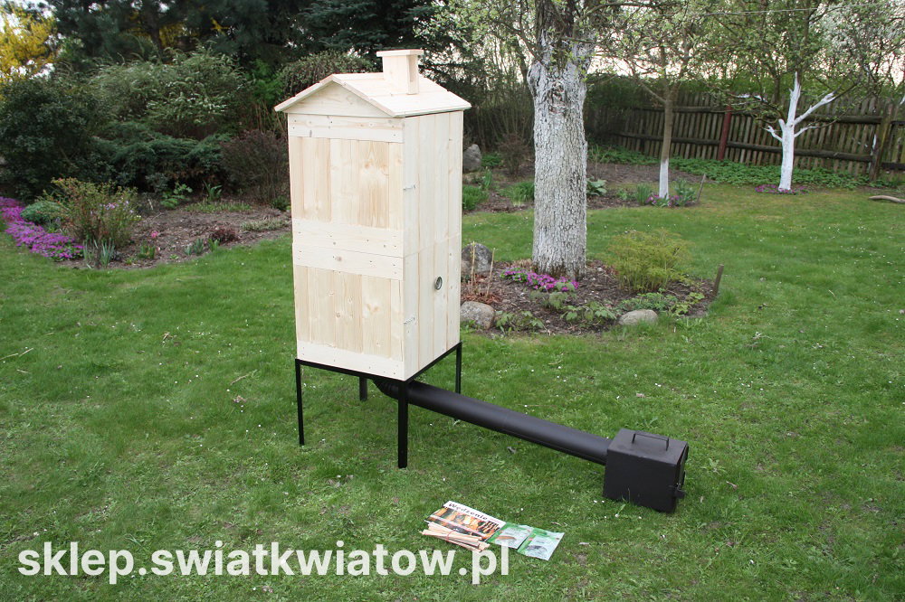 Oferowana wędzarnia wyróżnia się zastosowaniem bardzo solidnych materiałów i fachowym wykonaniem. Zrobiona została z deski świerku skandynawskiego, który cechuje się wysoką odpornością na wilgoć, zróżnicowane temperatury i zmienne warunki atmosferyczne. Deski łączone są za pomocą metody pióro-wpust, co daje idealną szczelność wędzarni. Do budowy komory zostały wykorzystane solidne i mocne deski o średniej grubości 2 cm. Wędzarnia ma bardzo prostą konstrukcję, przez co jej zainstalowanie nie będzie stanowiło problemu. Idealnie dopasowane elementy są połączone na wkręty i dodatkowo wzmocnione gwoźdźmi a pozostałe części montowane na wcisk. Komin na daszku wędzarni jest również wykonany z drewna, co zapobiega przedostawaniu się korozji do wędzonek. Skrzynia wędzarni jest niemalowana. Zapobiega to osadzaniu się oparów na produktach znajdujących się w skrzyni wędzarni. Komorę wędzarni przykrywa zdejmowany daszek o wysokości 20 cm. Komora wędzarni jest przeznaczona do ustawienia metalowym stelażu, wykonanym z kątownika i grubej blachy. W dnie znajduje się wycięty otwór do przyłączenia kanału dymnego.
