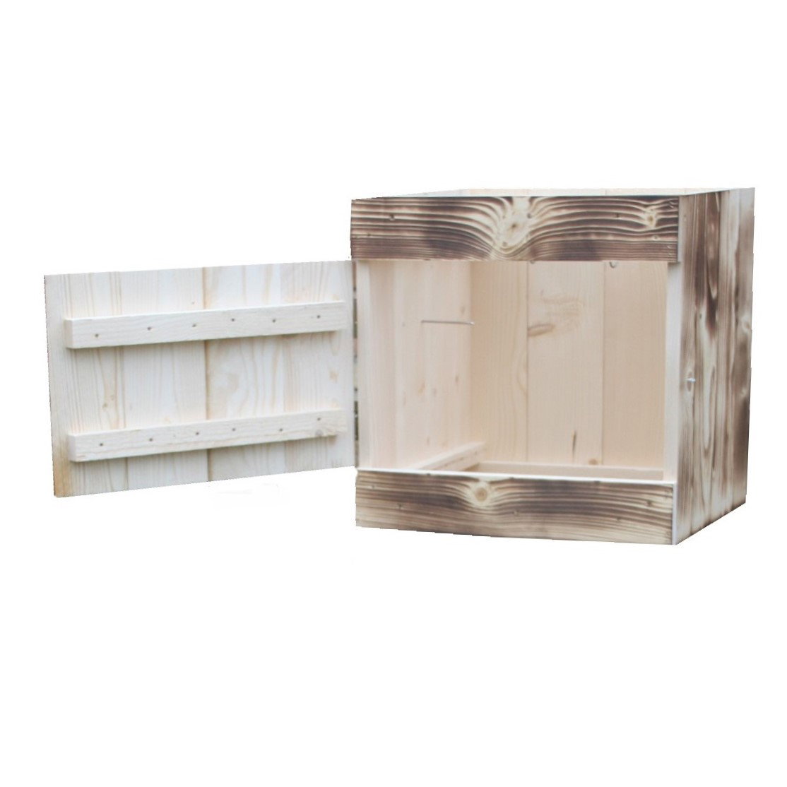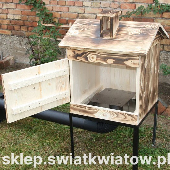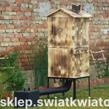 Oferowana wędzarnia wyróżnia się zastosowaniem bardzo solidnych materiałów i fachowym wykonaniem. Zrobiona została z deski świerku skandynawskiego, który cechuje się wysoką odpornością na wilgoć, zróżnicowane temperatury i zmienne warunki atmosferyczne. Deski łączone są za pomocą metody pióro-wpust, co daje idealną szczelność wędzarni. Do budowy komory zostały wykorzystane solidne i mocne deski o średniej grubości 2 cm. Wędzarnia ma bardzo prostą konstrukcję, przez co jej zainstalowanie nie będzie stanowiło problemu. Idealnie dopasowane elementy są połączone na wkręty i dodatkowo wzmocnione gwoźdźmi a pozostałe części montowane na wcisk. Komin na daszku wędzarni jest również wykonany z drewna, co zapobiega przedostawaniu się korozji do wędzonek. Komorę wędzarni przykrywa zdejmowany daszek o wysokości 20 cm. Komora wędzarni jest przeznaczona do ustawienia metalowym stelażu, wykonanym z kątownika i grubej blachy. W dnie znajduje się wycięty otwór do przyłączenia kanału dymnego. Opalane deski są w naturalny sposób impregnowane, zyskują również ciekawy wygląd.