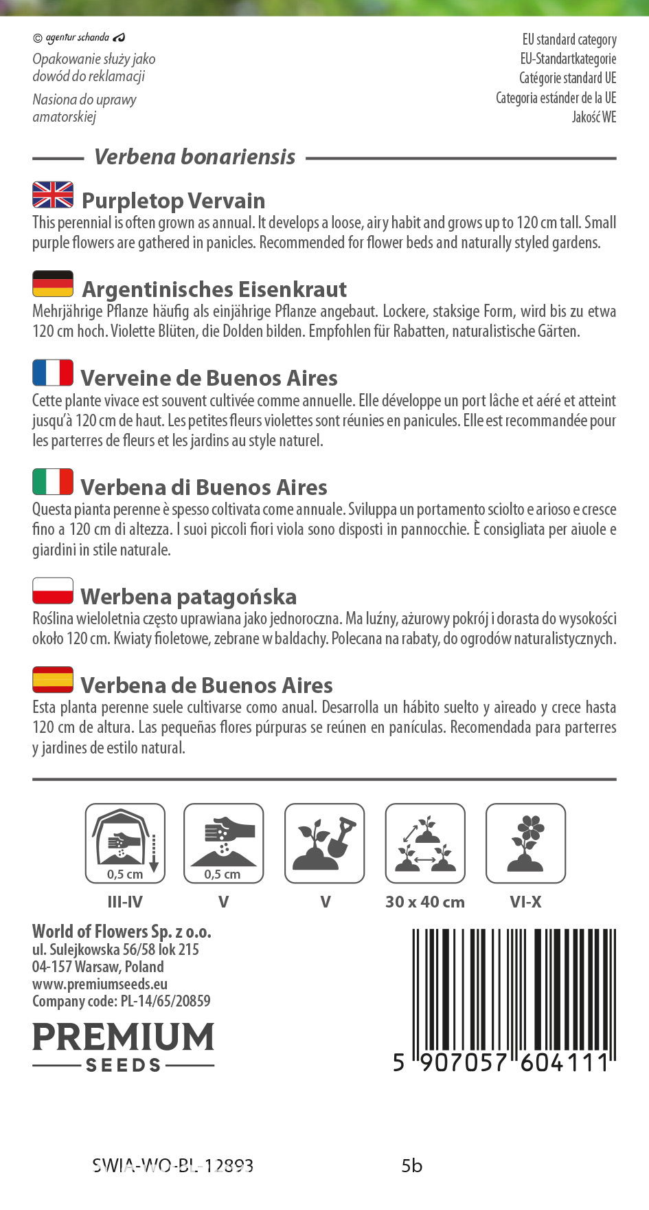 Werbena patagońska to jednoroczna roślina ozdobna, dorastająca do około 120 cm wysokości, charakteryzująca się liliowymi kwiatami, zebranymi w baldachowate kwiatostany, który zdobią roślinę od lipca, aż do jesiennych przymrozków. Może być używana do obsadzania wysokich rabat kwiatowych lub jako tło dla niższych. Werbena patagońska jest bardzo chętnie odwiedzana przez motyle.