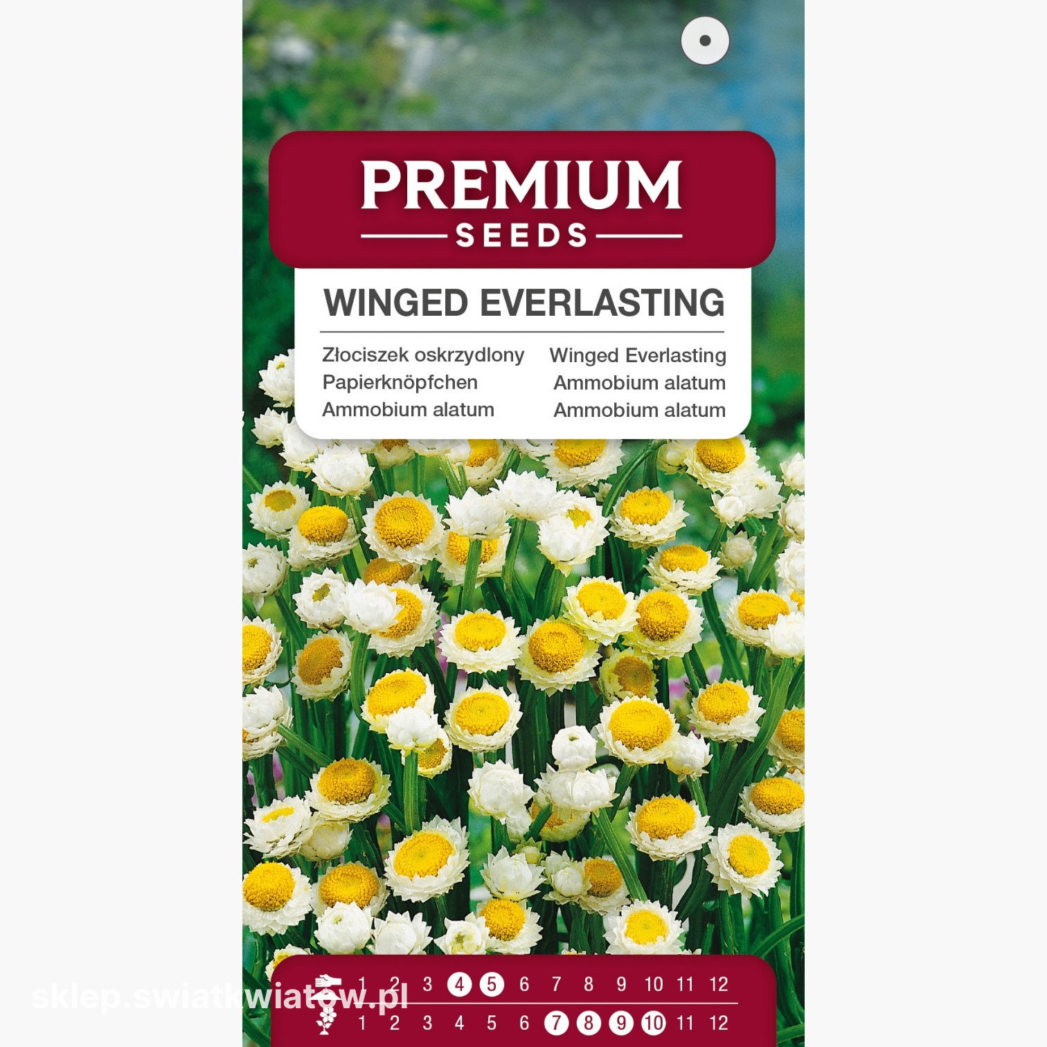 Złociszek oskrzydlony, znany także jako wiekuistka, to jednoroczna roślina ozdobna, ceniona za swoje kuliste, białe kwiaty z wyraźnym żółtym środkiem. Dorasta do 50–70 cm wysokości, tworząc wzniesione, rozgałęzione pędy otoczone rozetą szerokich liści. Świetnie sprawdza się na rabatach i w ogrodach skalnych. Najczęściej uprawiany jest z myślą o suchych bukietach, które zachowują swój urok na długo po zasuszeniu. Dzięki naturalnemu wyglądowi i długiemu okresowi kwitnienia, wzbogaca każdą ogrodową kompozycję.